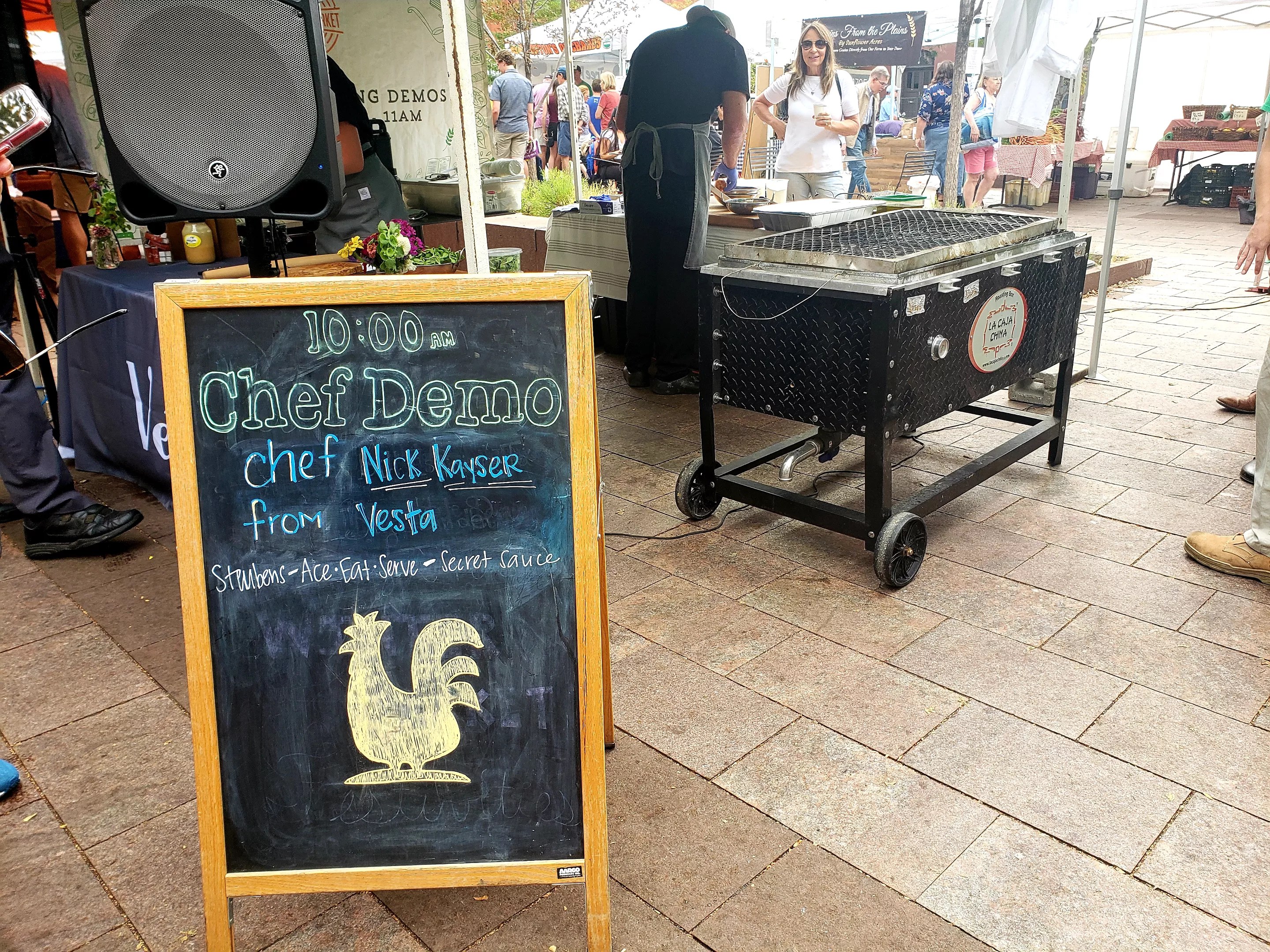 “This time of year for the farmers’ market is absolutely perfect,” Kayser told an audience eager to try his creation. “You get some of the fall and stone fruits, foraged mushrooms – you can’t go wrong.”