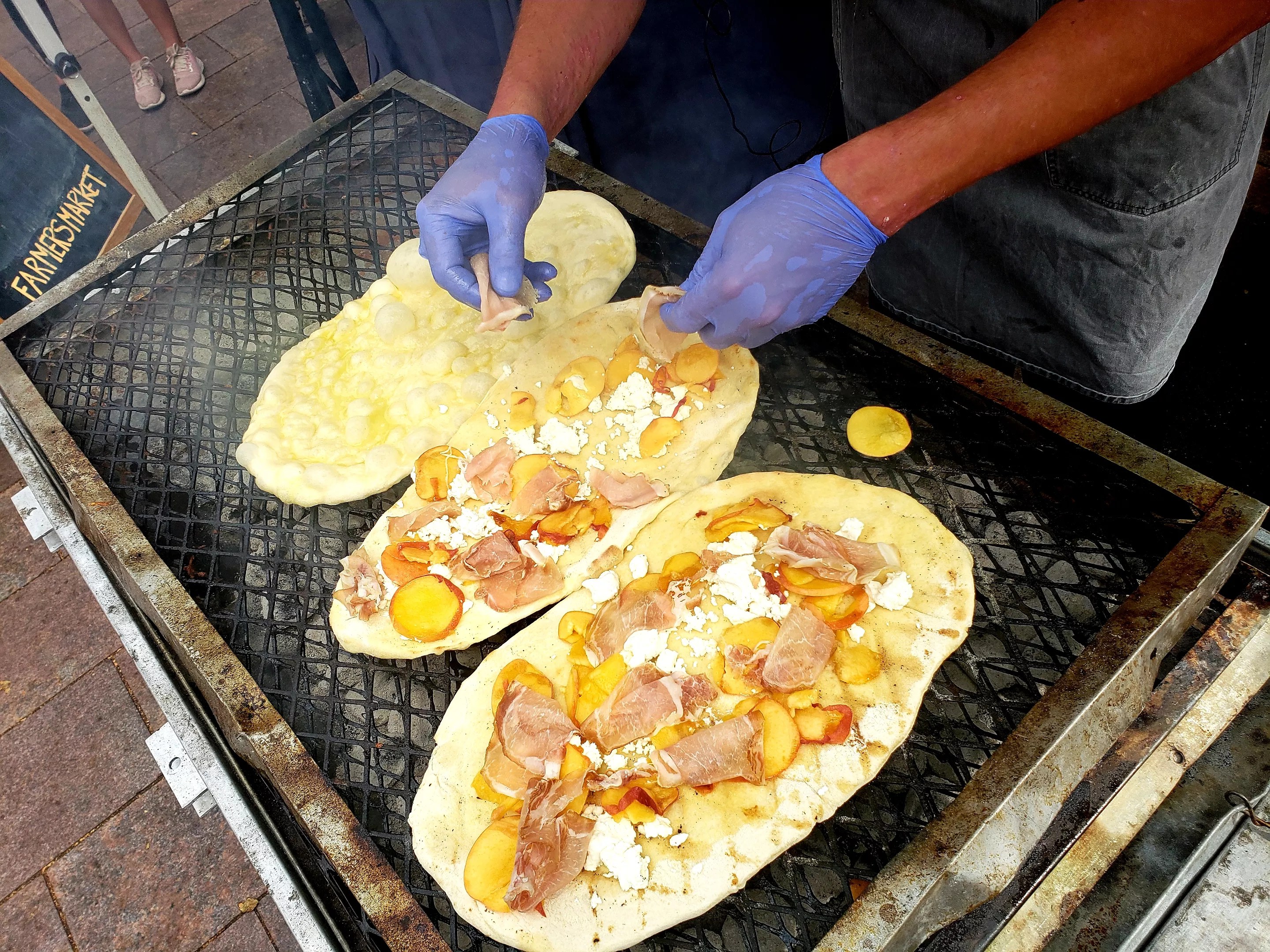 Chefs Nick Kayser and Nadine Donovan aren’t afraid to release the heat, especially when peaches and the Union Station Farmers’ Market are involved. This past Saturday they rolled in their own charcoal grill from Vesta and grilled flatbreads topped with the fresh stone fruit during their cooking demo.