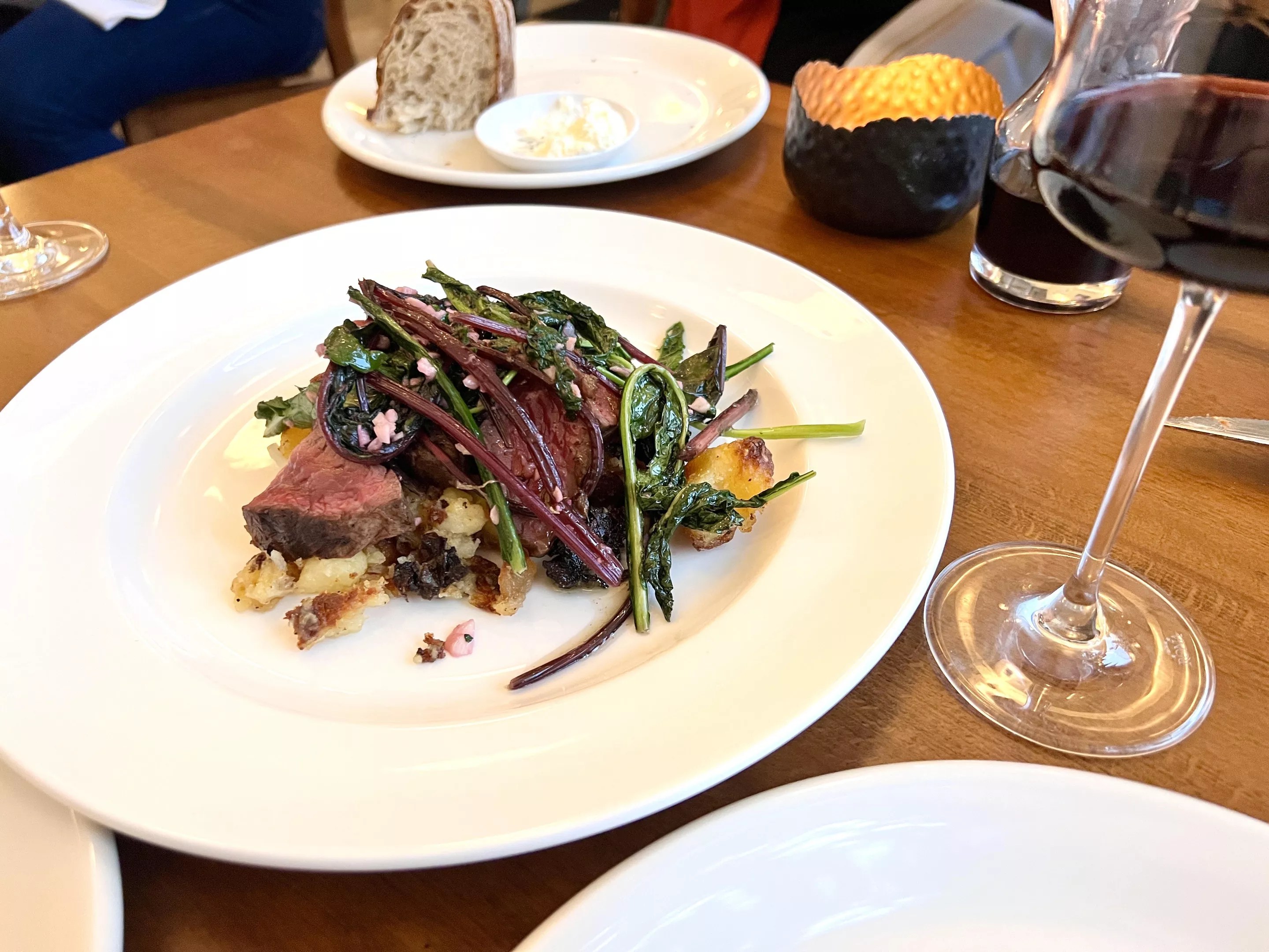At first glance, the offerings appear limited and humble. Each of the dozen dishes, however, is dialed in with such finesse and nuance that choosing which items to order is an ever-present dilemma. Dishes range in size from smaller snacks of briney marinated olives ($8) to larger composed entrees such as grilled hanger steak with savory anchovy butter, wilted greens and crispy potatoes ($29).