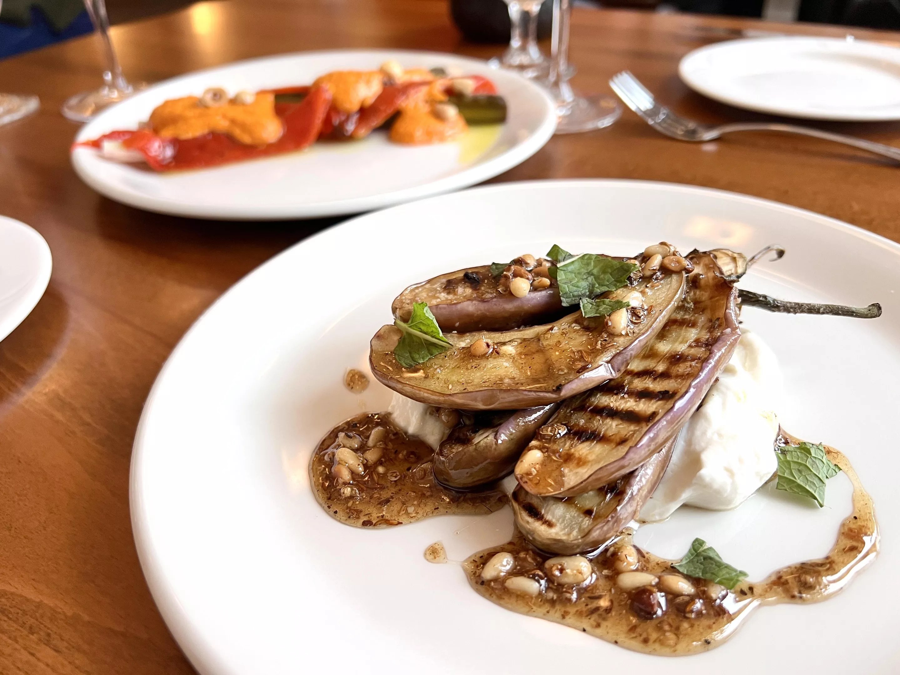For mid-sized plates, diners are treated to fantastic vegetable-forward creations and housemade semolina pastas. Grilled baby leeks are paired with roasted sweet peppers, topped with generous dollops of a garlicky romesco sauce and a scattering of toasted hazelnuts ($15). Tender fairytale eggplants are layered atop swirls of whipped ricotta; fresh mint and a drizzle of coriander-and-cumin-spiced honey balance the dish with an earthy sweetness ($14). Adley’s extensive experience in pasta and sauce production shines, as a deeply flavorful Bolognese clings to tubes of fresh rigatoni ($24). Meanwhile, zucchini and bite-sized tomatoes join golden strands of bucatini in a silky saffron sauce that is an elegant ode to summer ($23).