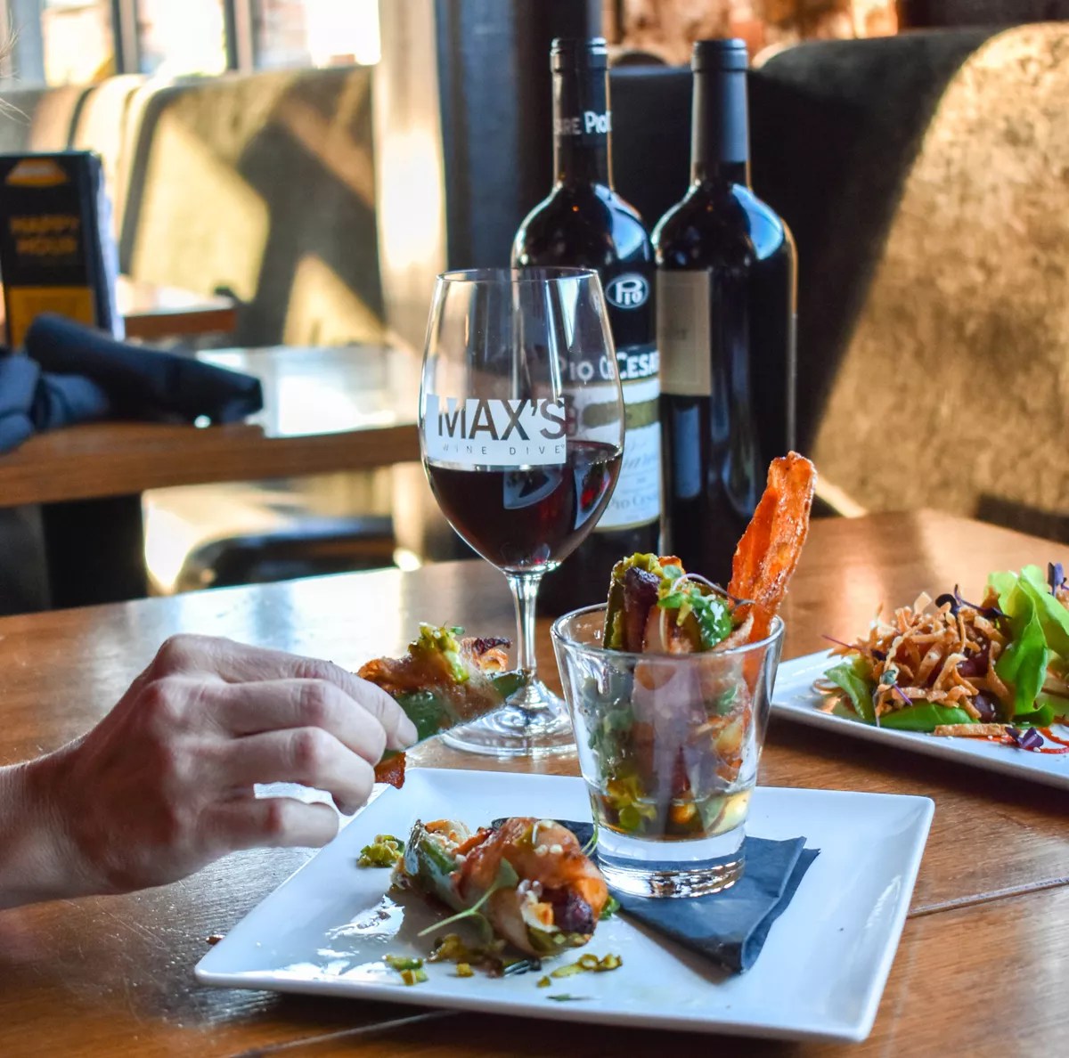 On general manager Chris David’s recommendation, we ordered Last Judgment, a jammy red blend out of California, one of Max’s Wine Dive’s proprietary bottles. Patrons have access to a handful of wines on tap, too, along with a well-sourced international wine list and all the requisite cocktails.