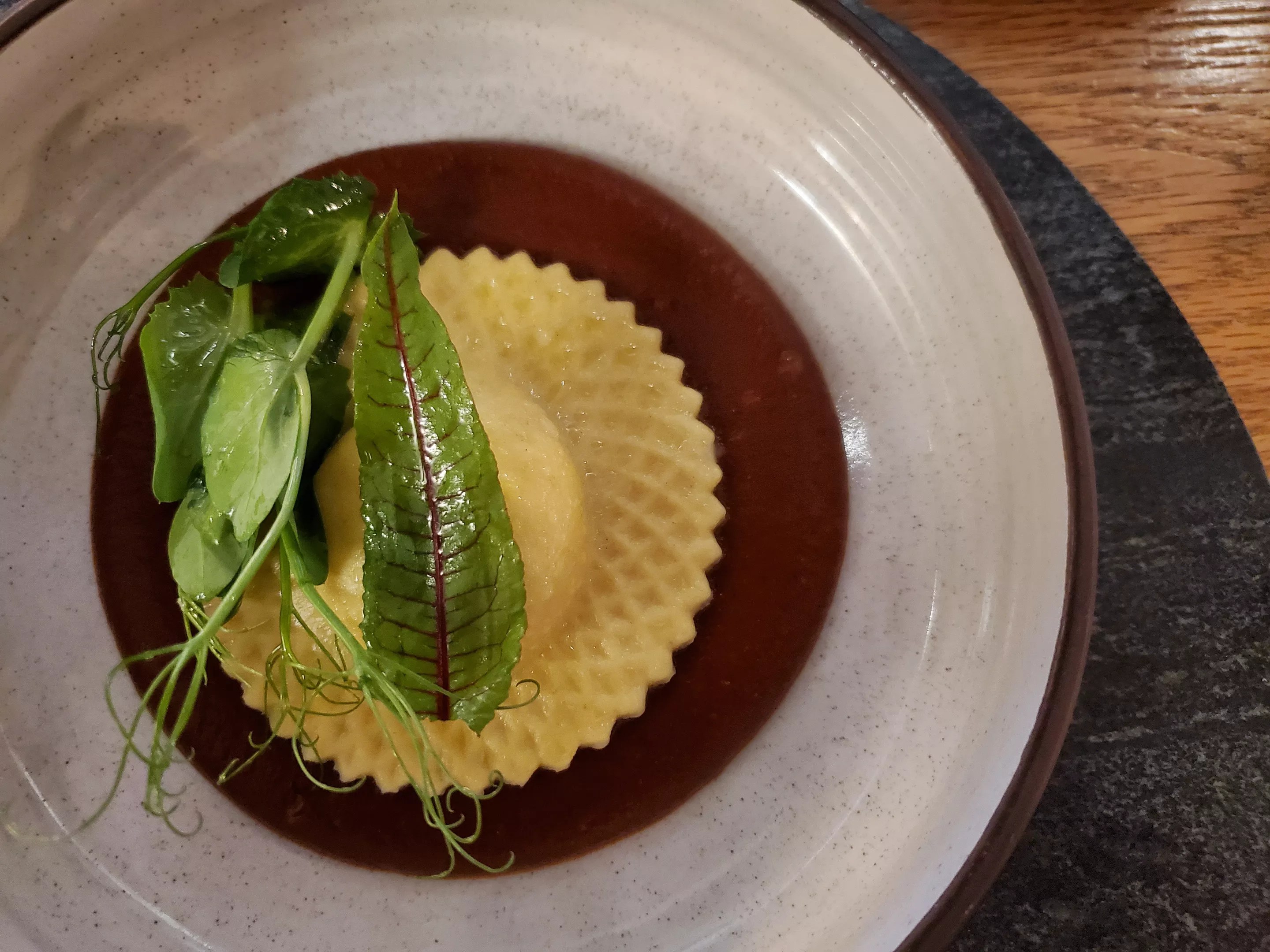 A raviolo filled with smoked mushrooms and queso fresco, served over chile Colorado.