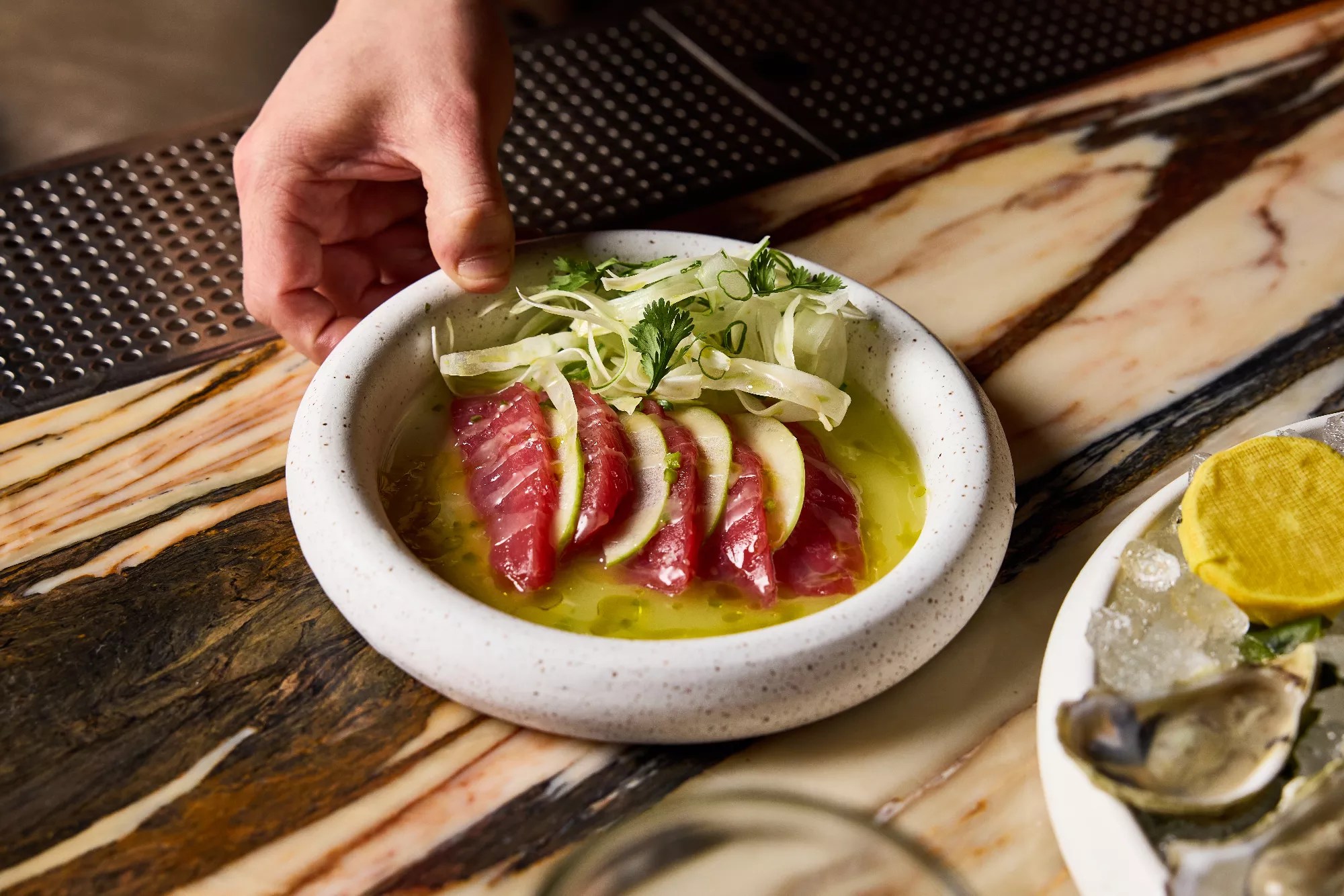 Curiel recommends starting with the Aguachile de Atun, slices of tuna belly layered with green apple in a bright broth made with fennel juice and lemon oil. This light and refreshing dish is a great way to kick off the meal.