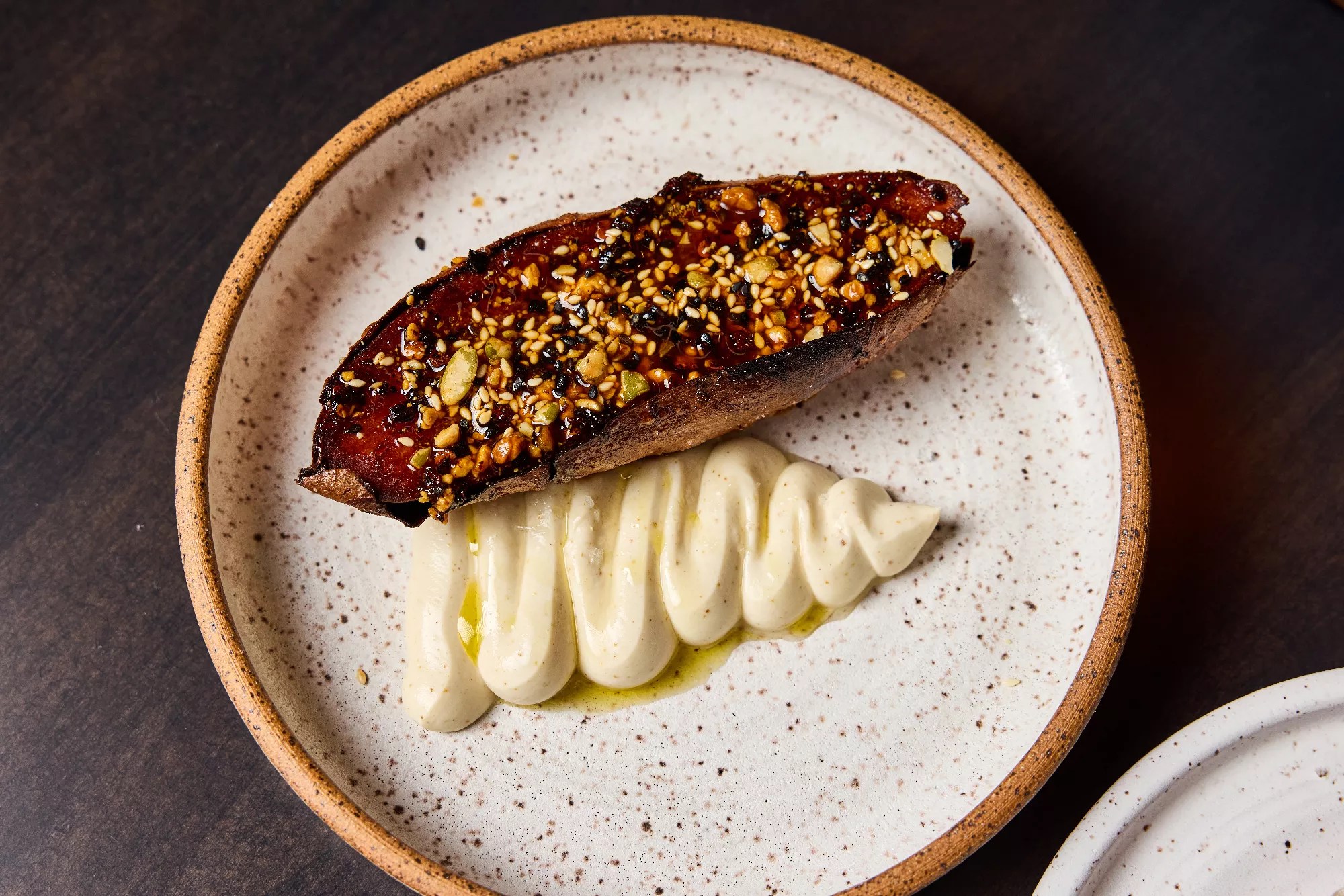 Among the starters is a dish that’s become a staple at Alma Fonda Fina, the Camote Asado. But here, the sweet potato with whipped requesón and salsa macha is made a bit differently. “It’s a bigger potato, cooked in the hearth, so you get those smoky notes from the wood fire,” he says. “This is the dish people talk about all the time, so we re-engineered it and did it our own way.”
