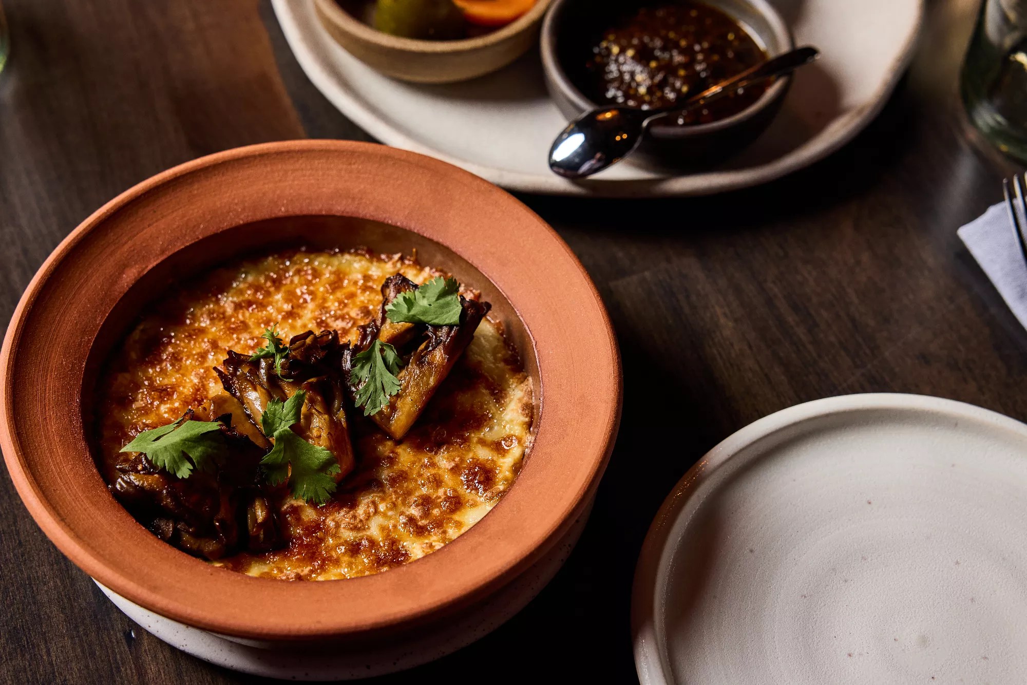 The only other familiar component is another hit from Alma, the sourdough tortillas. Here, they come with queso fundido, a dish that is often found on restaurant menus in Jalisco – including that of Curiel’s father. Alteño’s take on the melty cheese is topped with wild mushrooms and served with pasilla salsa on the side for a dish that’s anything but one-note.