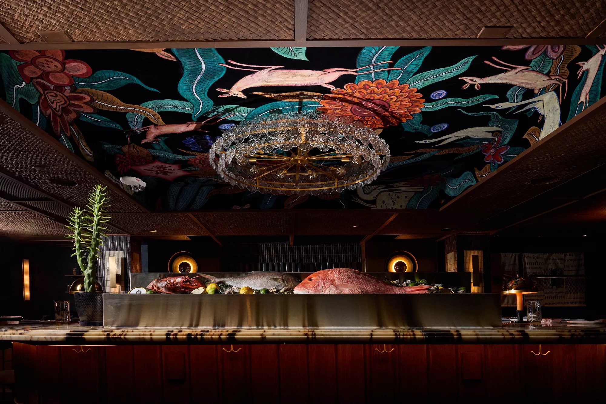 The dark and sexy decor by Agatha Jane Interior Design includes many nods to Jalisco, including a collection of framed Mexican doilies and a hand-painted, Tonalá-style velvet mural above the raw bar by local artist Delton Demares.