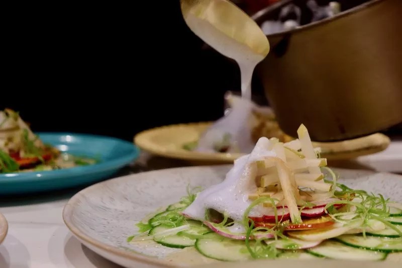 In Denver, Wilson worked a series of jobs before landing a gig at the Wolf’s Tailor, which Bon Appétit named one of America’s 10 Best New Restaurants in 2019. While working there, inspiration struck when he began getting invited to cook for immunocompromised people in their homes. “I was vaccinated and willing to wear a mask, and people wanted a Michelin-quality meal in the comfort of their home,” says Wilson. He began cooking at private dinner parties a few times a month and soon realized that his side hustle could become a full-fledged business.