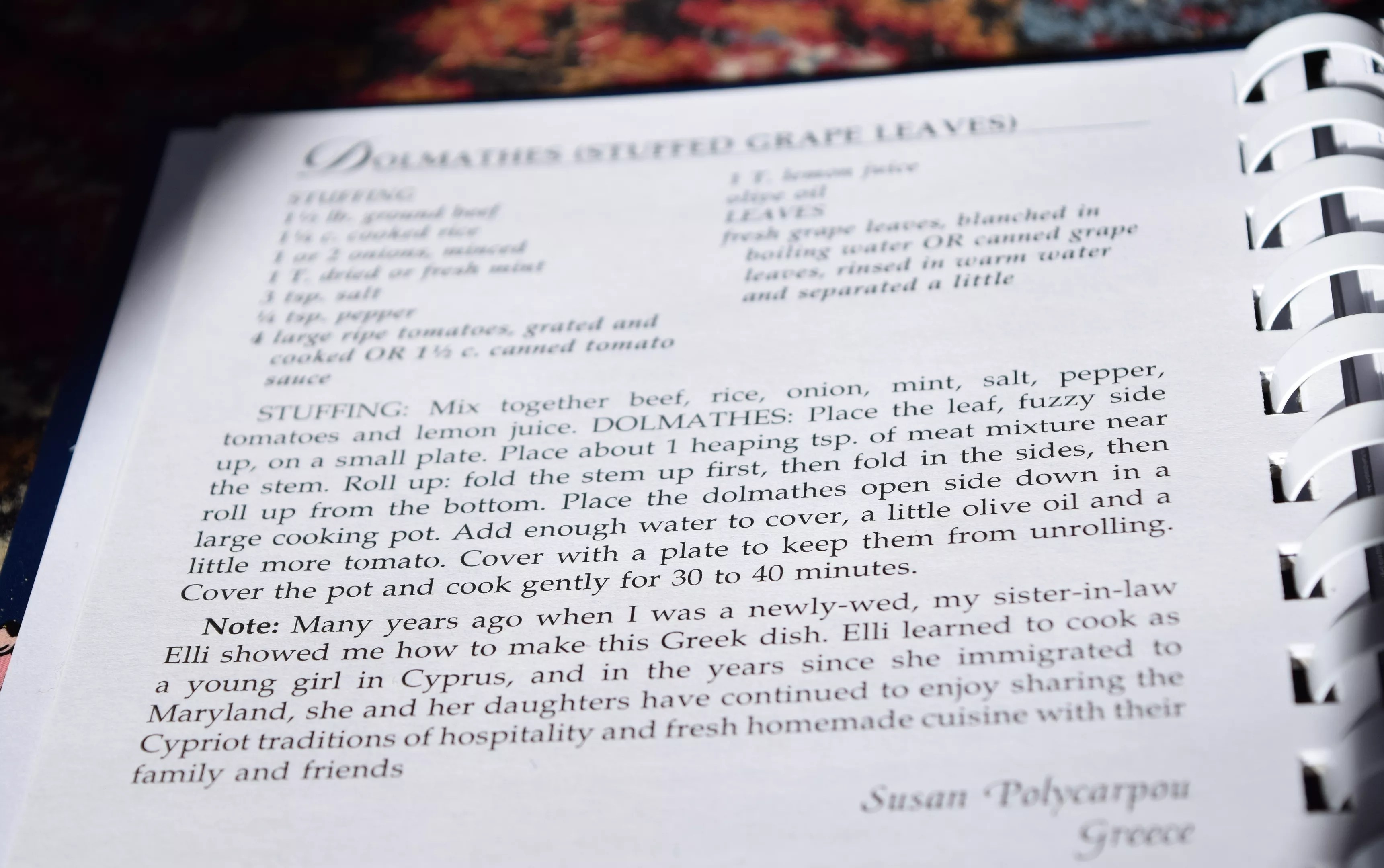 “Many years ago when I was a newly-wed, my sister-in-law Elli showed me how to make this Greek dish,” Susan Polycarpou writes in a new cookbook, Together at the Table: Recipes From Our Cultural Heritage. Dolmathes, or stuffed grape leaves, is one of many passed-down and loved recipes reflecting the stories and heritage of the book’s contributors.