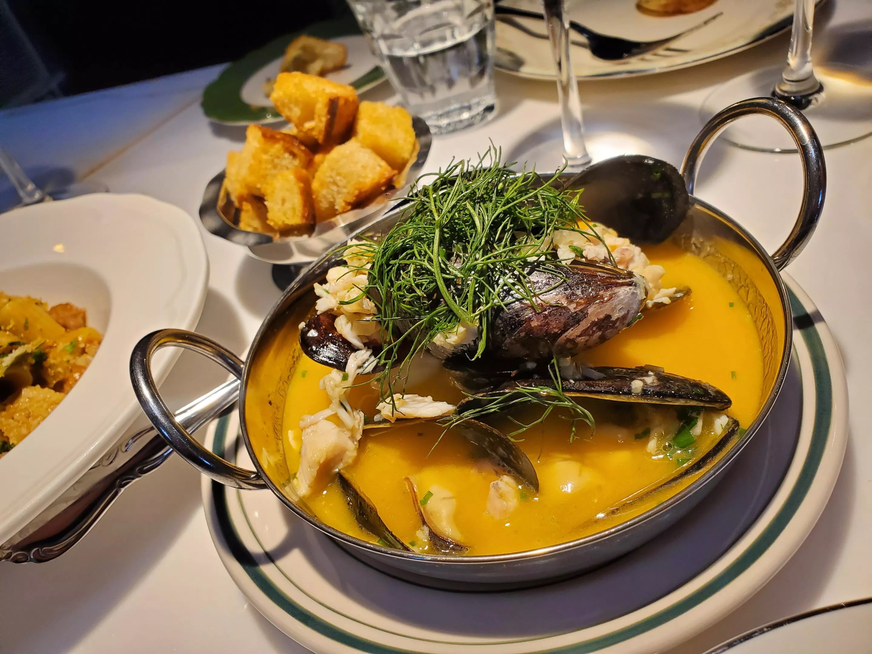 The mussels at Corsica come with croutons to soak up the saffron-crab broth.