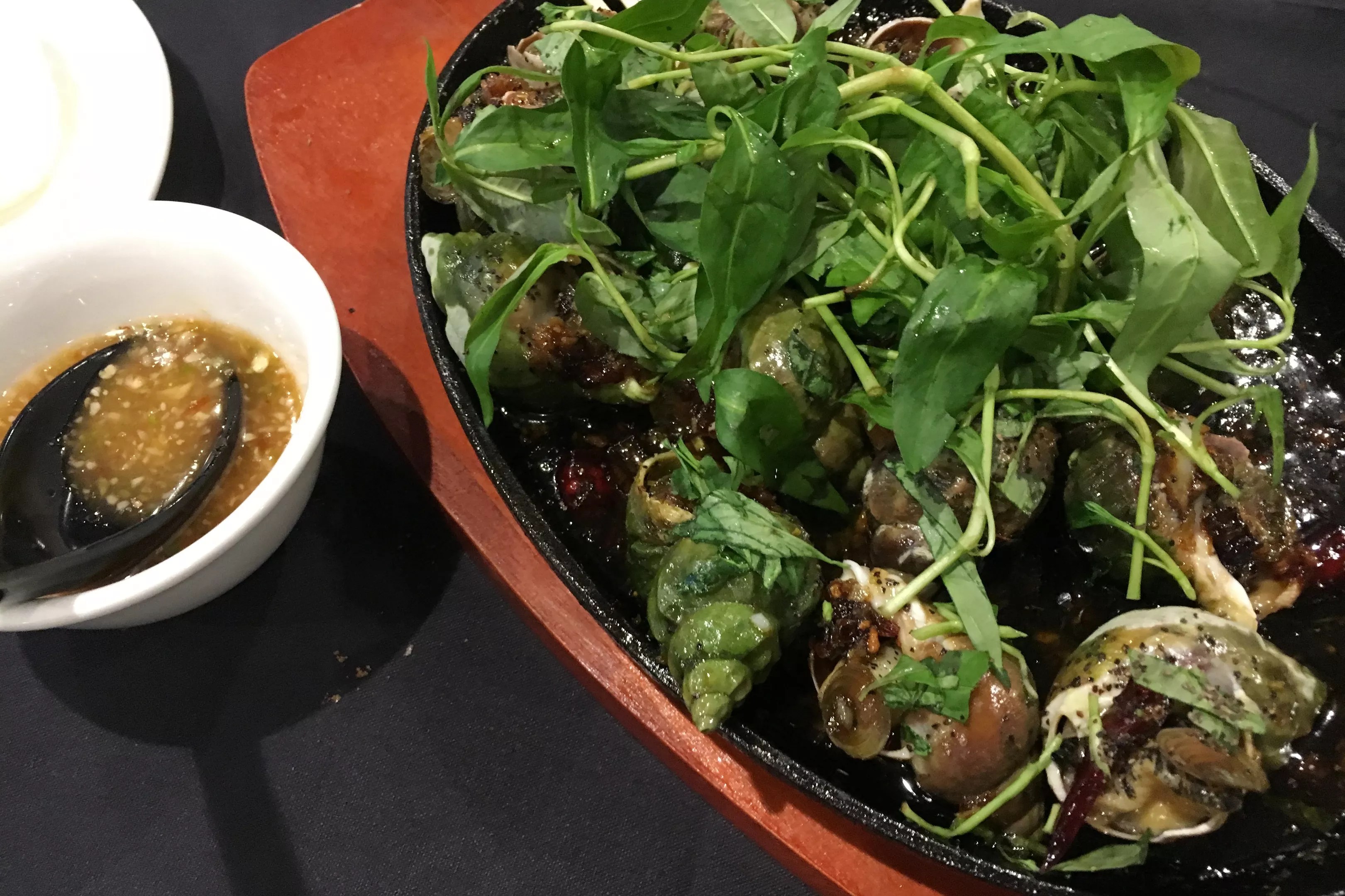 Nguyen points out that her pho (like everything else on the menu) is made from scratch, starting with an overnight simmer of beef bones before charred onion and ginger go into the pot with other spices. While Savory Vietnam’s menu isn’t quite as thick as that of New Saigon, it covers a broad range of noodle and rice bowls, stir-fries, salads, seafood and grilled meats. Escargot fans will find three styles served on sizzling plates, as well as different types of snails used as ingredients in other dishes, including a fresh and vibrant Savory Vietnam salad, loaded with shrimp, squid, jellyfish, pineapple, papaya and bright herbs and vegetables, some of which Nguyen orders directly from Vietnam.