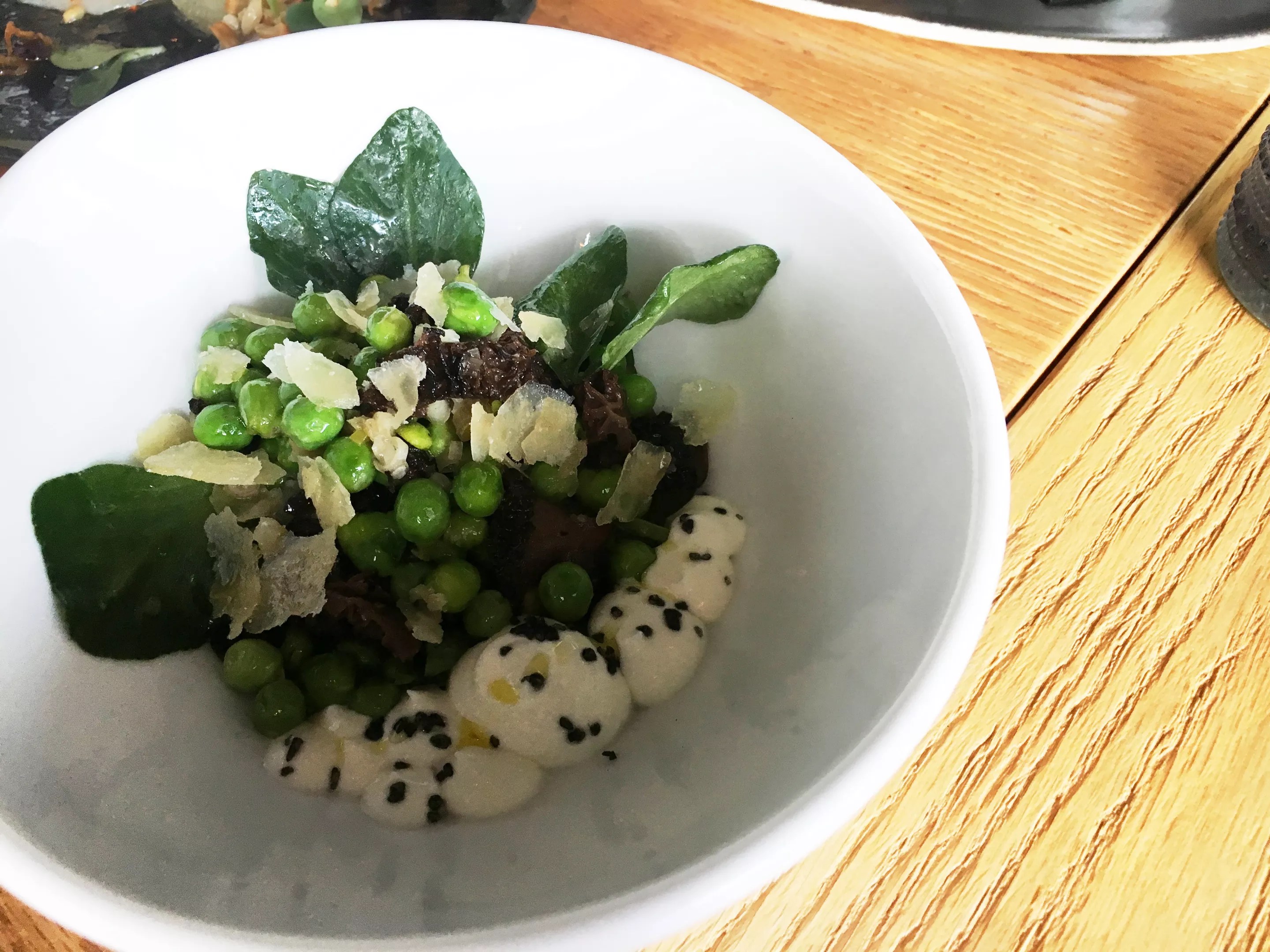 Peas and foraged morels add to this warm salad at Hearth & Dram.