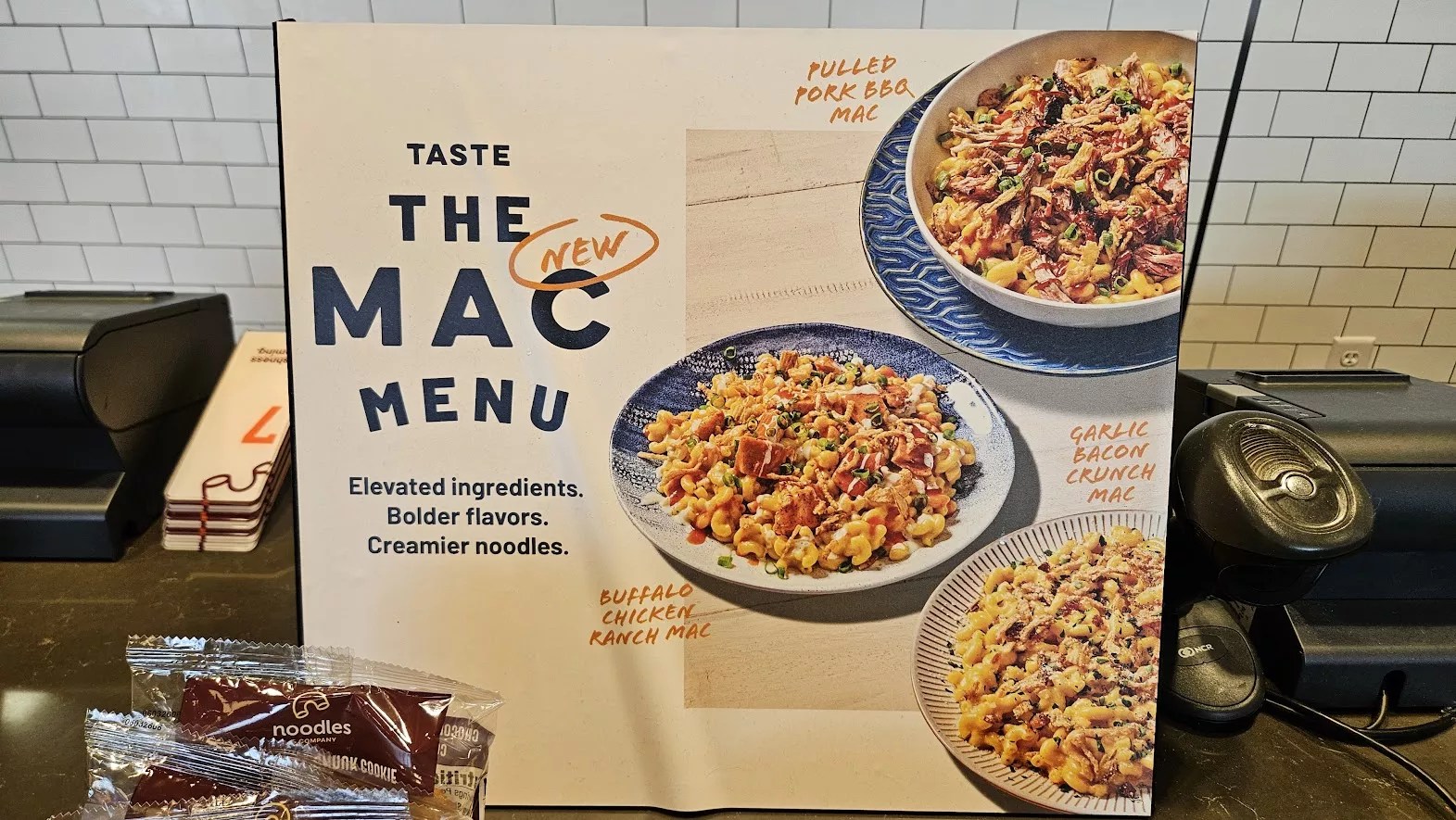 A sign extolling the virtues of the Mac Menu at Noodles & Company.