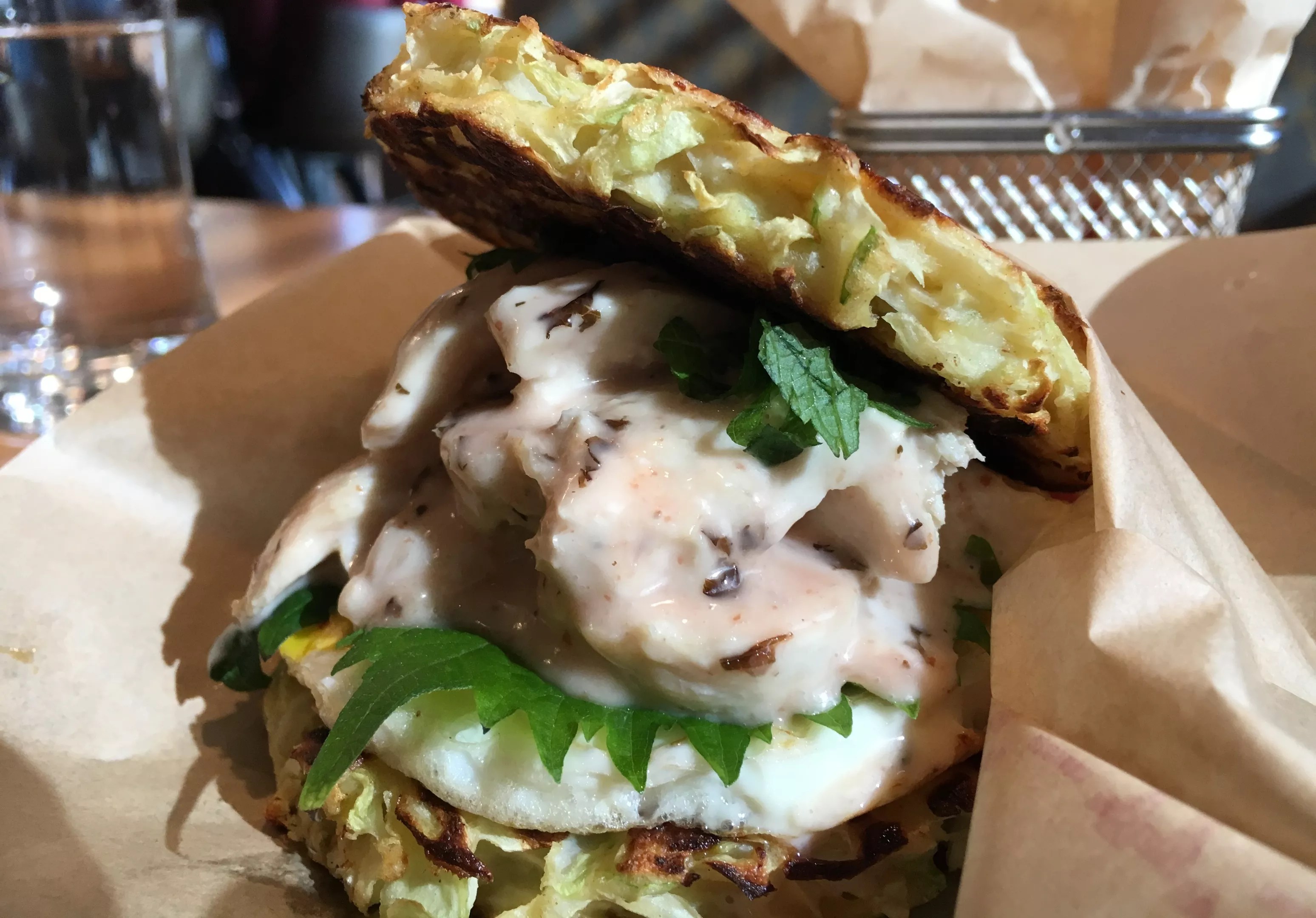 The ume chicken sandwich is flavored with tangy plum mayo and shiso leaves.