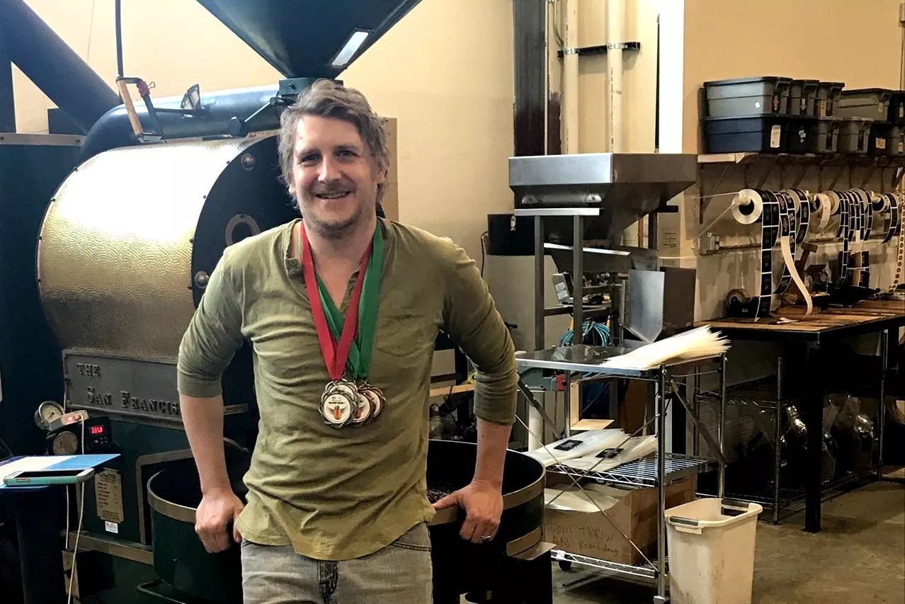 Brian Gerhard, head roaster for Pablo’s, with the medals his coffees earned at the Golden Bean North America.