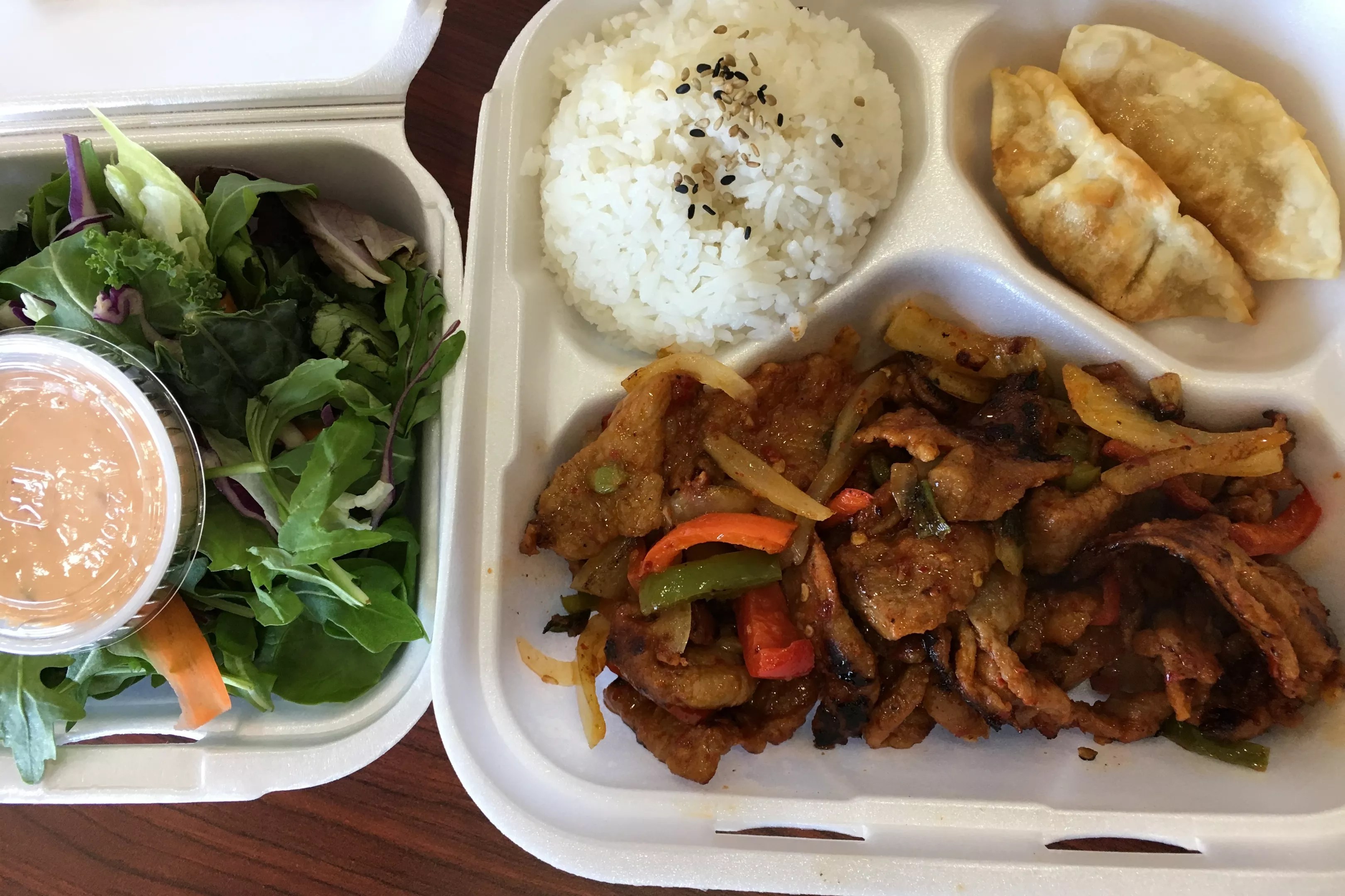 On the bento side of the menu, stir-fried bulgogi or spicy pork are good bets, and there’s also 911 Chicken if you’re in the mood for a real blast of heat. Each of the bento combos ring in under $10, making for an inexpensive way to change up your lunch routine. And you can always supplement with a side of cheese fries, jalapeño poppers (baked, not fried) or more fried dumplings.