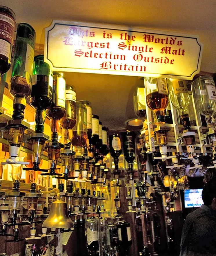 The collection of single-malt whiskey at Pints Pub, complete with special devices called optics to ensure a standard pour that would be legal by British standards.