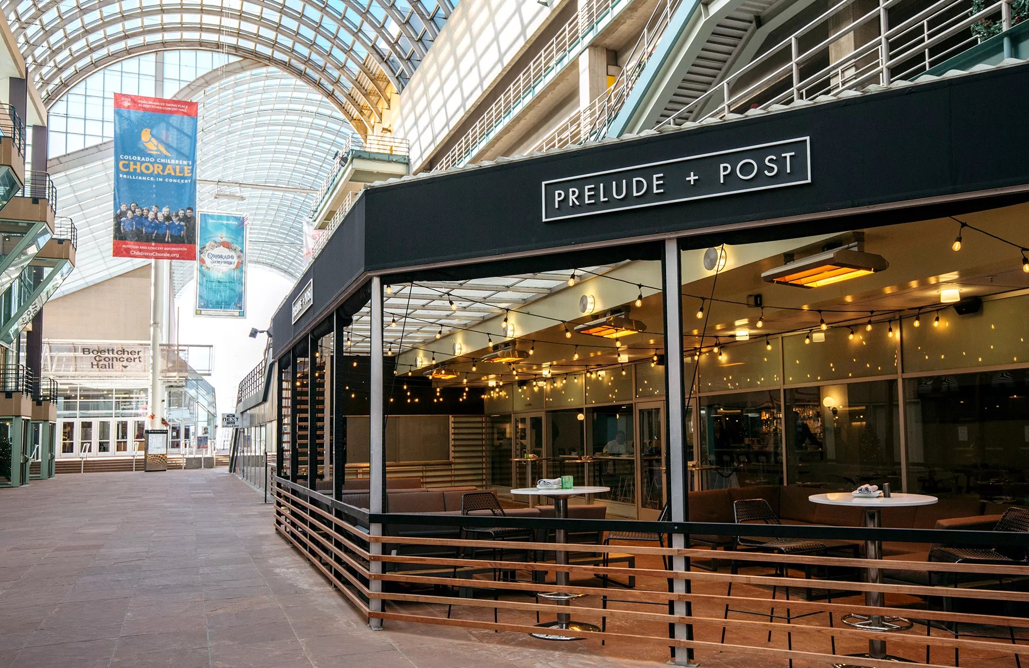 The menu at Prelude + Post, which opened last week, will be supplemented with produce from Blue Bear Farm, located on the grounds of the Colorado Convention Center nearby. The restaurant’s new accoutrements include an outdoor lounge with heaters extending out onto the promenade, making a great place for people watching or to enjoy brunch offered before all matinee shows. Inside, rotating artworks from local artists will be for sale.