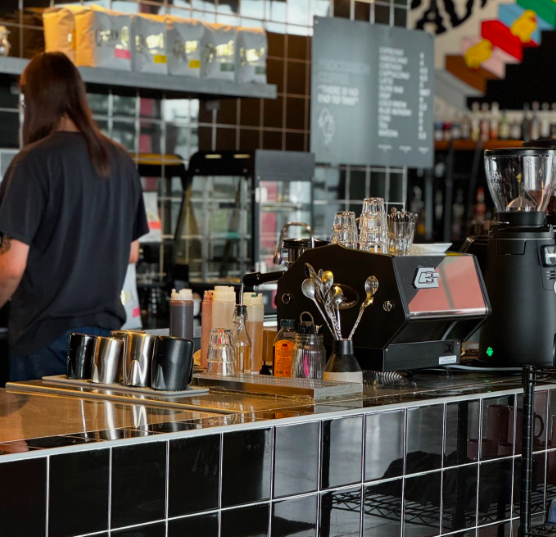 Procession’s new nineteen-foot-long coffee bar is decked out in sleek black subway tiles.