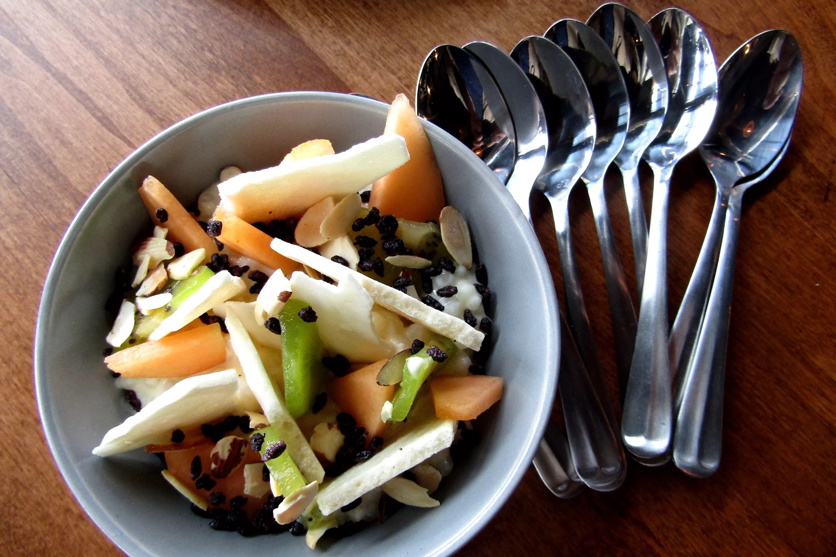 Tapioca with fruit, nuts and shards of meringue.