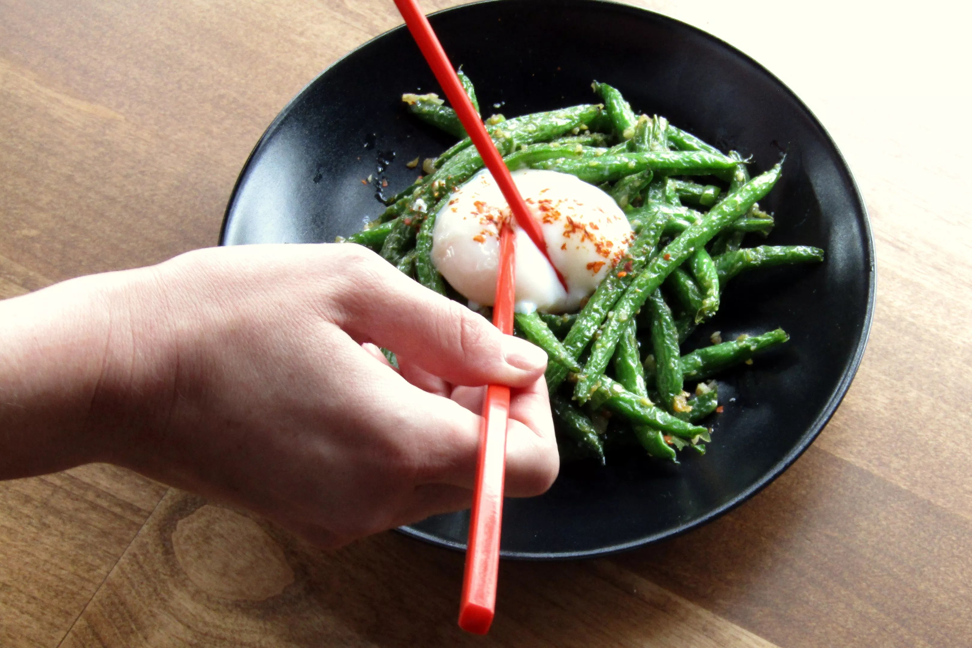 Sir-fried green beans with preserved mustard root, dried shrimp and a slow-cooked egg.