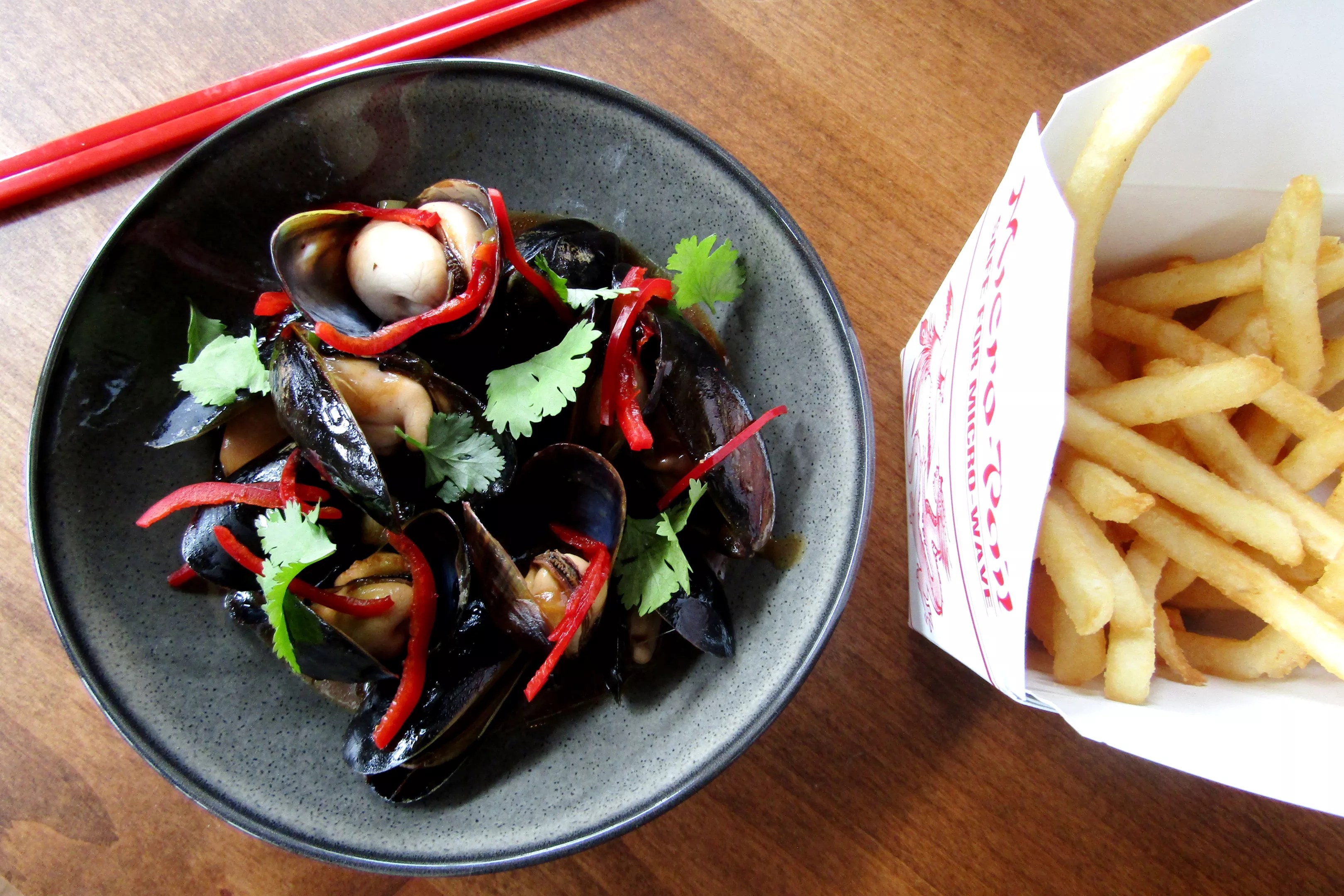 Mussels in black bean sauce with a takeout container of fries.