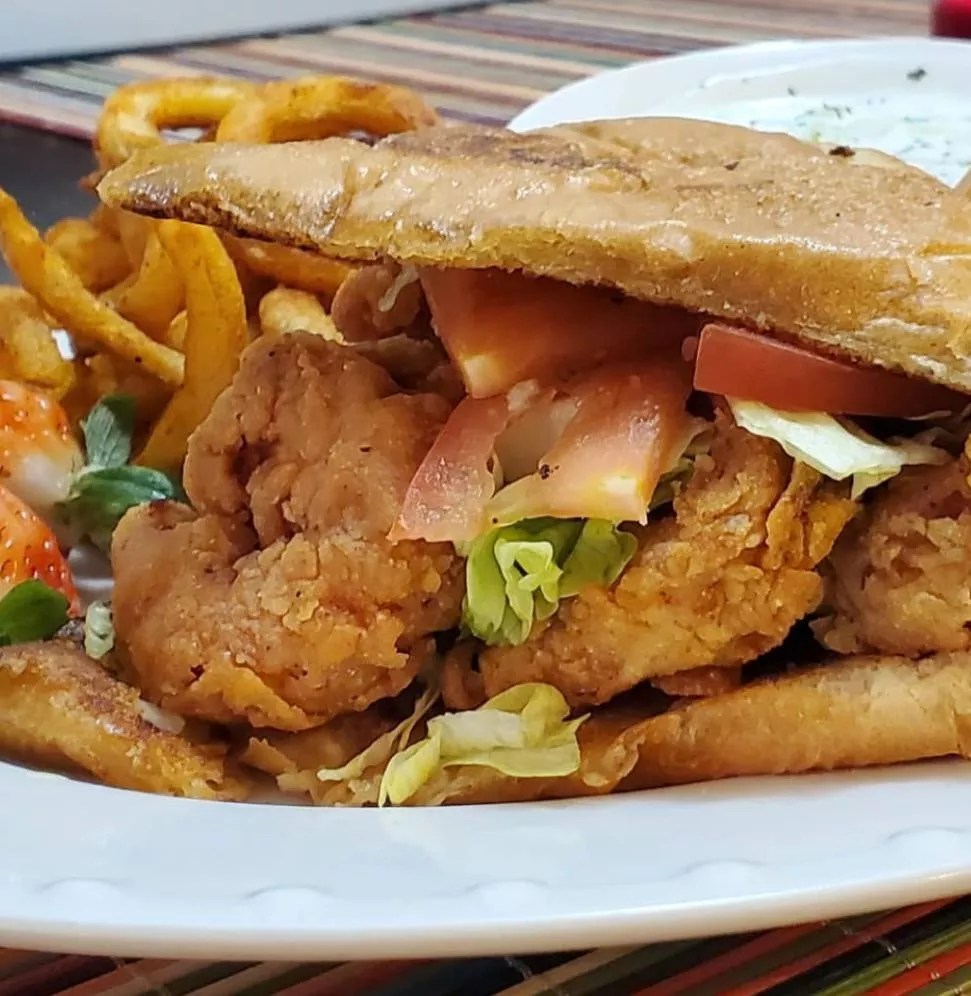 Seafood makes several appearances on QueLisa’s menu, including this fried shrimp sandwich.