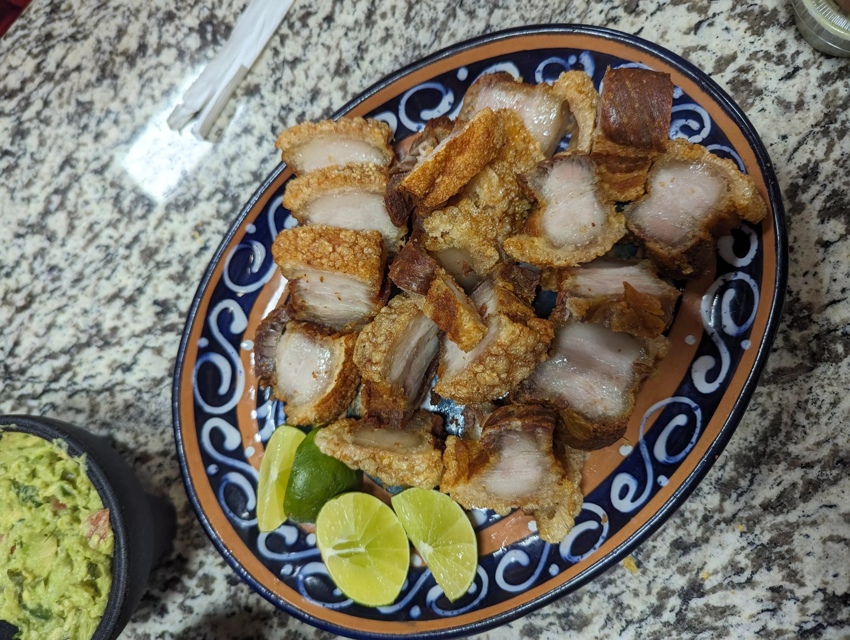 Served chopped into large, bite-sized pieces on a platter with lime, these are not the light and airy skin-only pork rinds from the snack aisle; this is the kind of stuff you can wrap in a tortilla with some salsa and call a meal.
