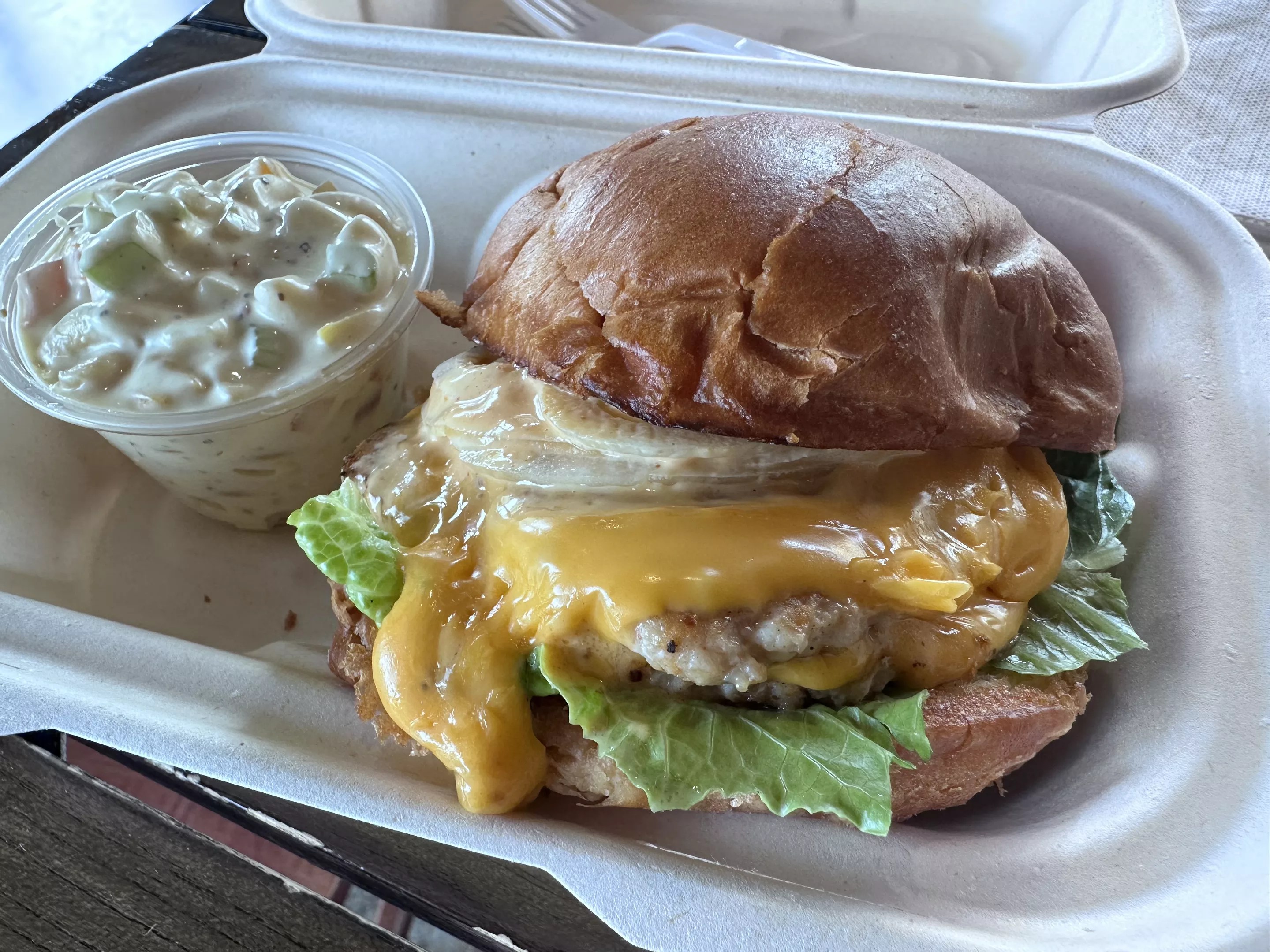 Double Chicken Smash Burger made with locally sourced RedBird Farms chicken breast and thighs, house-ground into a patty, smashed and seared, then topped with melted cheese, onions, lettuce, and a homemade special sauce.