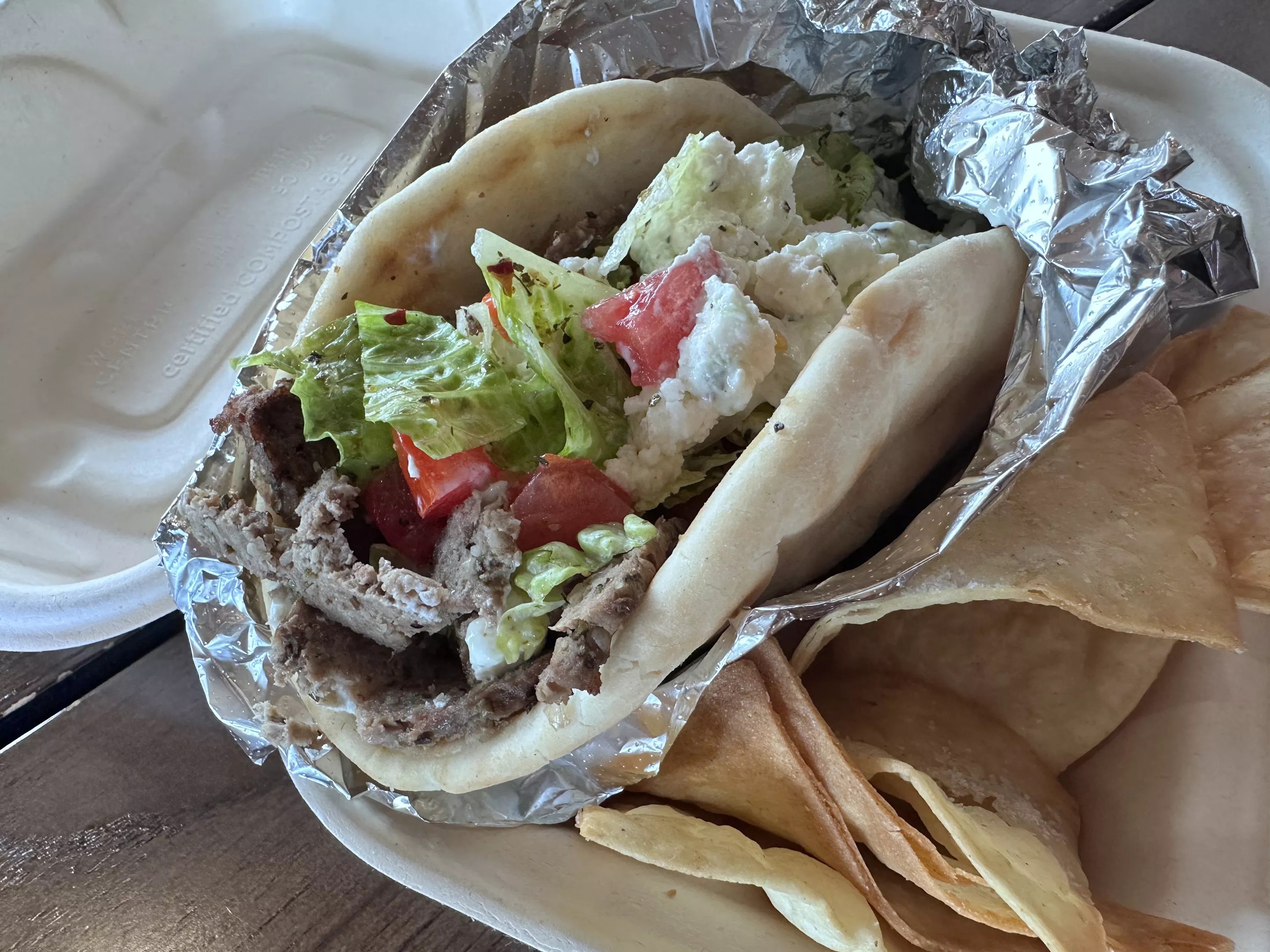 Greek Gyro with housemade gyro meat crafted from locally sourced Bowers Family Farms beef and veal, served on warm pita with feta, tomato, Gree seasoning, and scratch-made tzatziki.