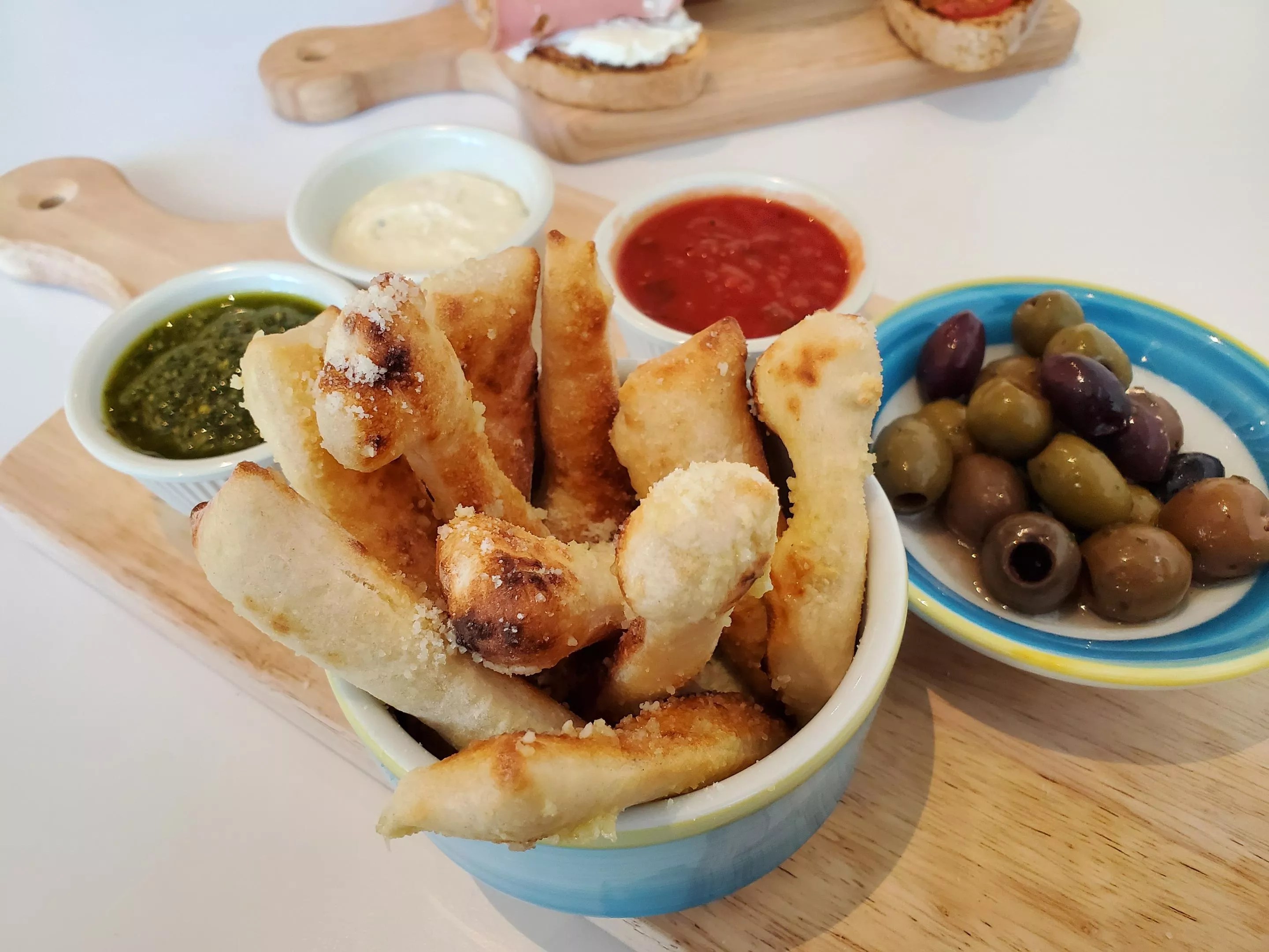 The menu is rounded out with charcuterie and cheese boards, a variety of bruschetta, salads and several desserts. One fast hit at the location has been the Pizza Bite, chewy strips of baked dough topped with Parmesan and served with nut-free basil pesto, Parmesan cream and marinara for dipping. “Kids love these,” Siska says.