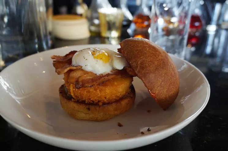 Now Waters has launched a new project, Run for the Roses, in a subterranean space beneath the Dairy Block in LoDo, where it out-cools Black Eye while capturing some of that spot’s early-twentieth-century panache. While classic cocktails are the draw here, one item made the jump from Black Eye – and from breakfast to late-night snack.