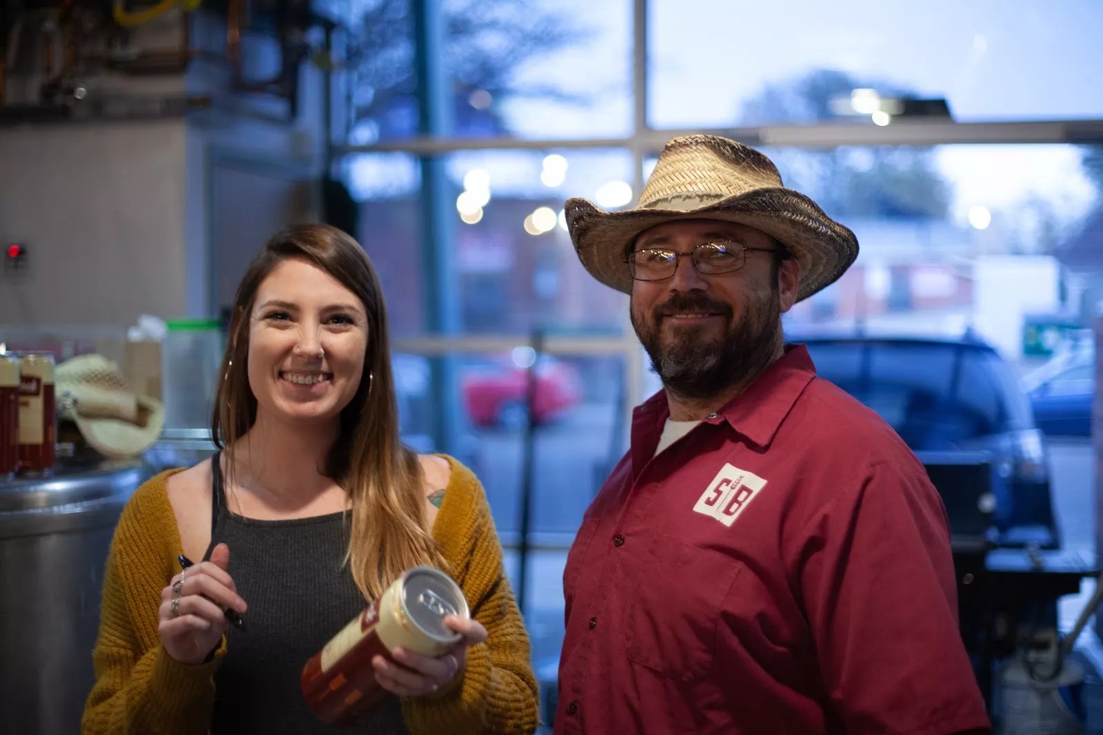 Jason Abbott (right) and taproom manager Leah at the brewery.