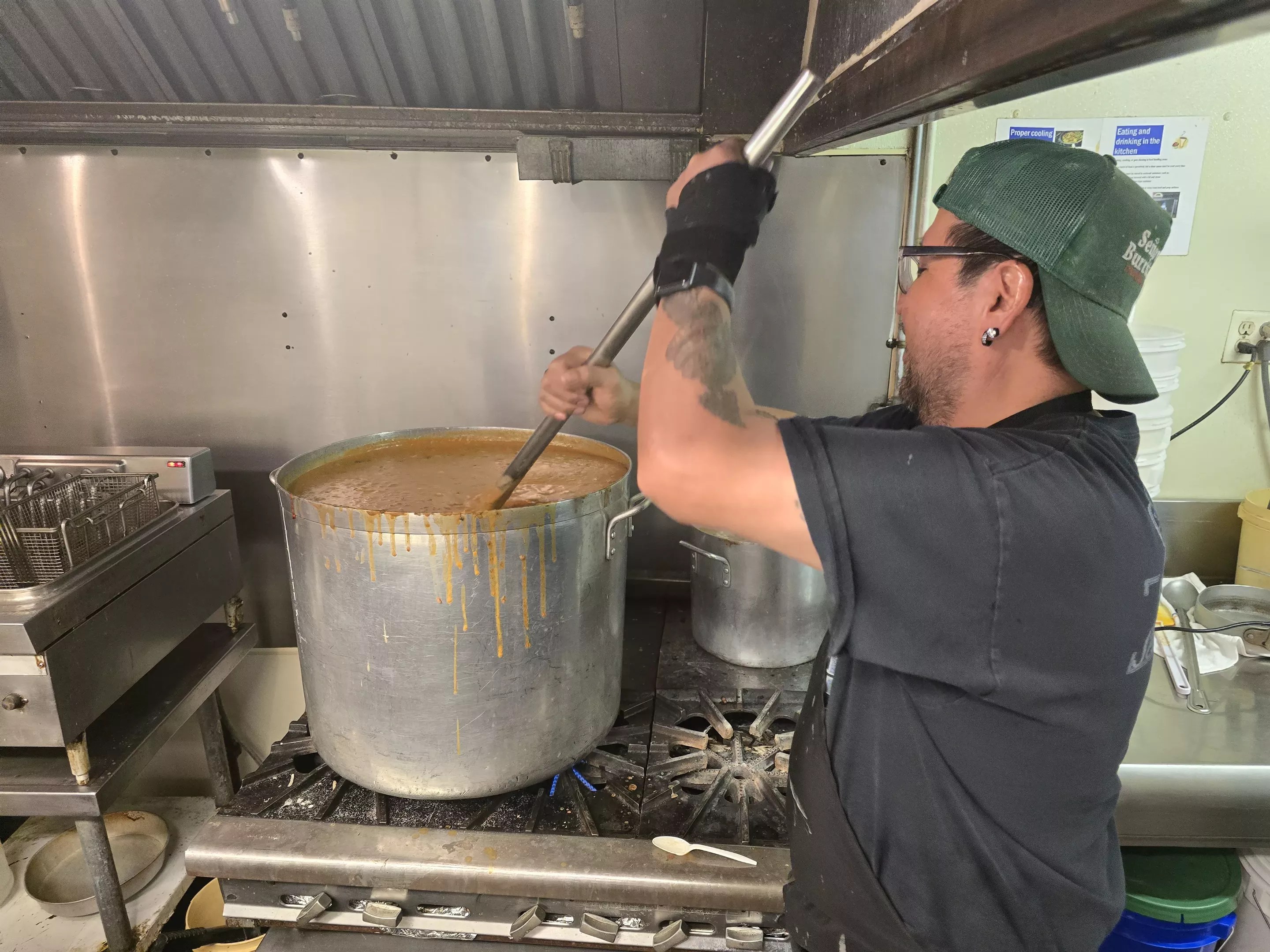 Chef Sergio Baladez stirring a big pot of green chile at the Baker location before it closed.