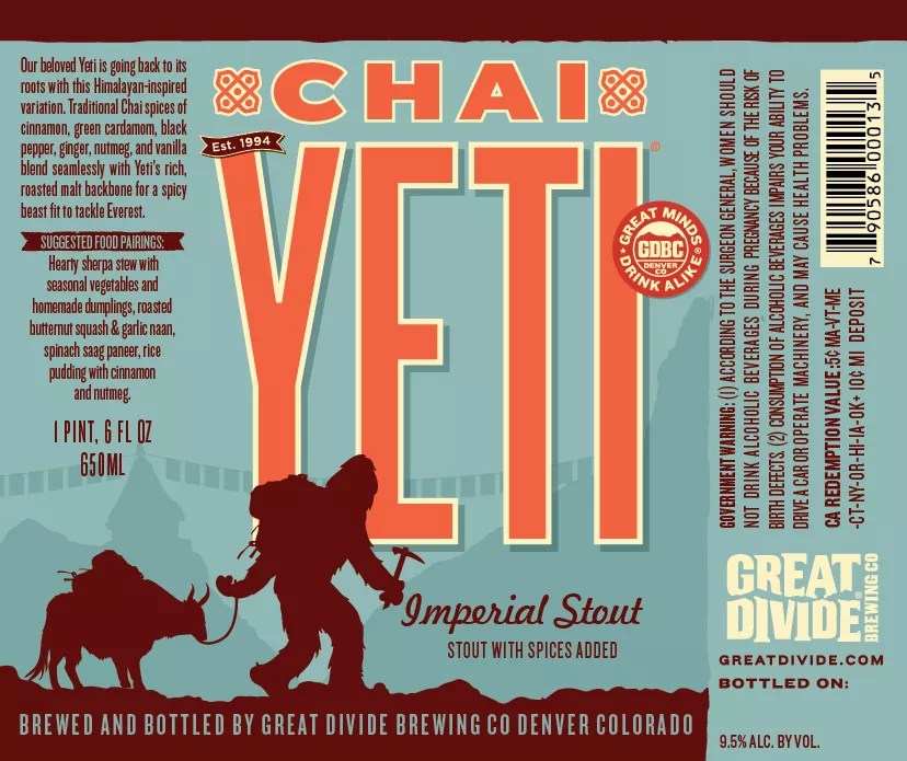 Great Divide has been fairly conservative over the years about messing with its signature Yeti Imperial Stout, adding only a few variations every couple of years or so; these have included Chocolate Oak Aged Yeti, Espresso Oak Aged Yeti, Oatmeal Yeti and the draft-only, lower-ABV Velvet Yeti Nitro. The latest of these will be quite different, though, as it incorporates the traditional chai spices of cinnamon, green cardamom, ginger, black pepper, nutmeg and vanilla. The mixture is appropriate since many Yeti tales originate in the Himalayas in Nepal, a region that also gave us chai. If you believe, then this beer, which debuts in October, is for you.