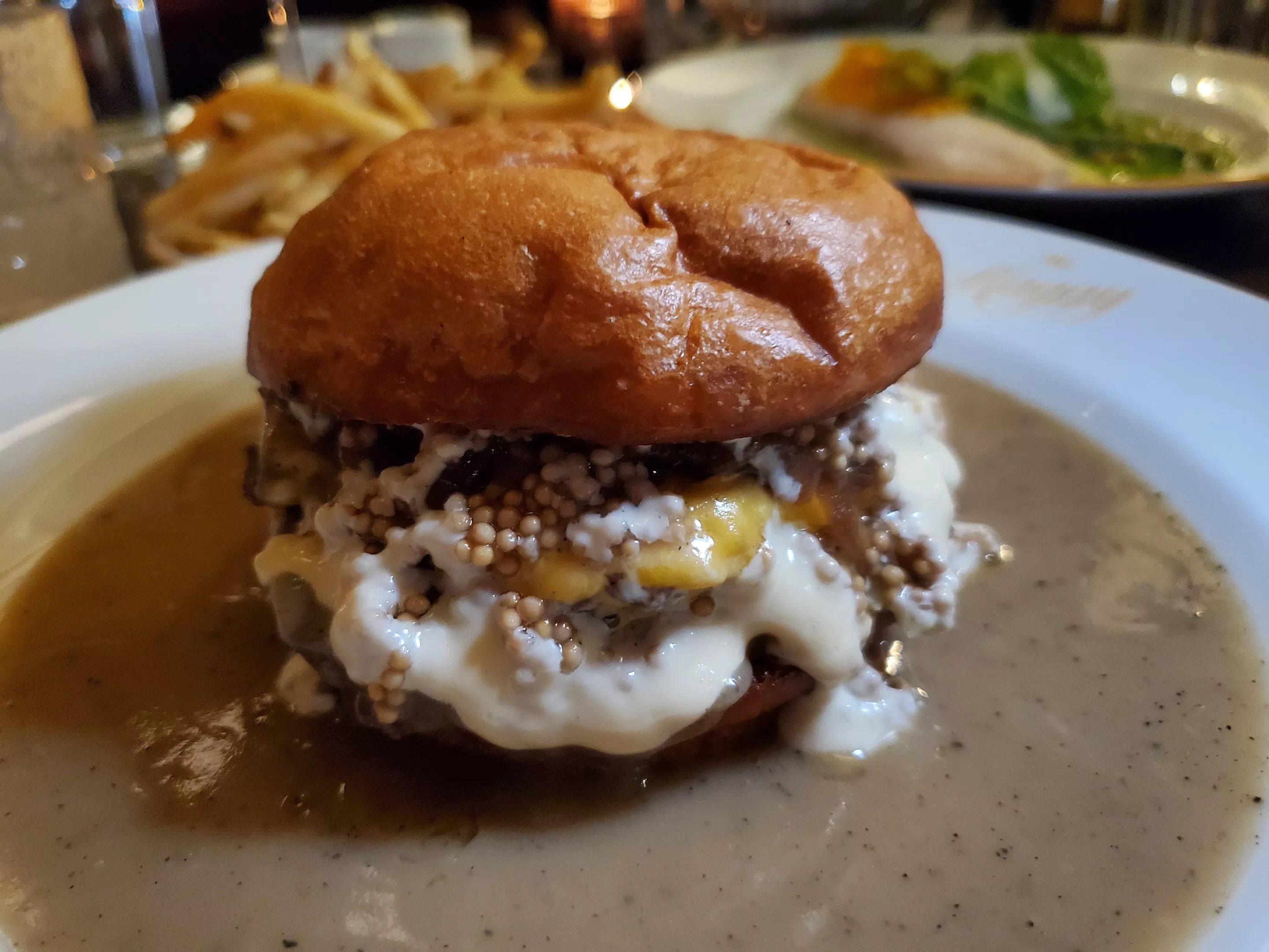 When I spoke to chef Ludo Lefebvre last fall about his plans for Chez Maggy, the restaurant he opened inside the new Thompson Hotel on Market Street, he promised a “kick-ass” burger. And while I’m still on the fence about a hamburger that you must eat with a fork and a knife, this burger is definitely the most decadent in town. At $28 (without fries), it may also be the most expensive, but the combination of American cheese, pickled mustard seeds, smoked mayo and beer-braised onions piled on a big burger that’s literally swimming in pepper gravy indeed kicks ass.