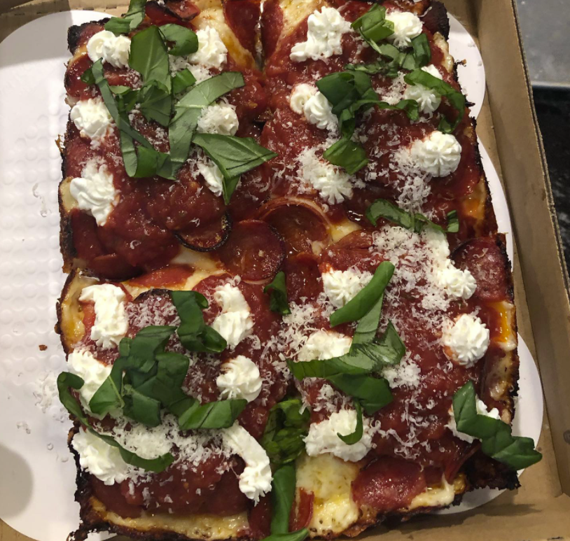Pepperoni, ricotta basil Detroit-style from Get Sauced.