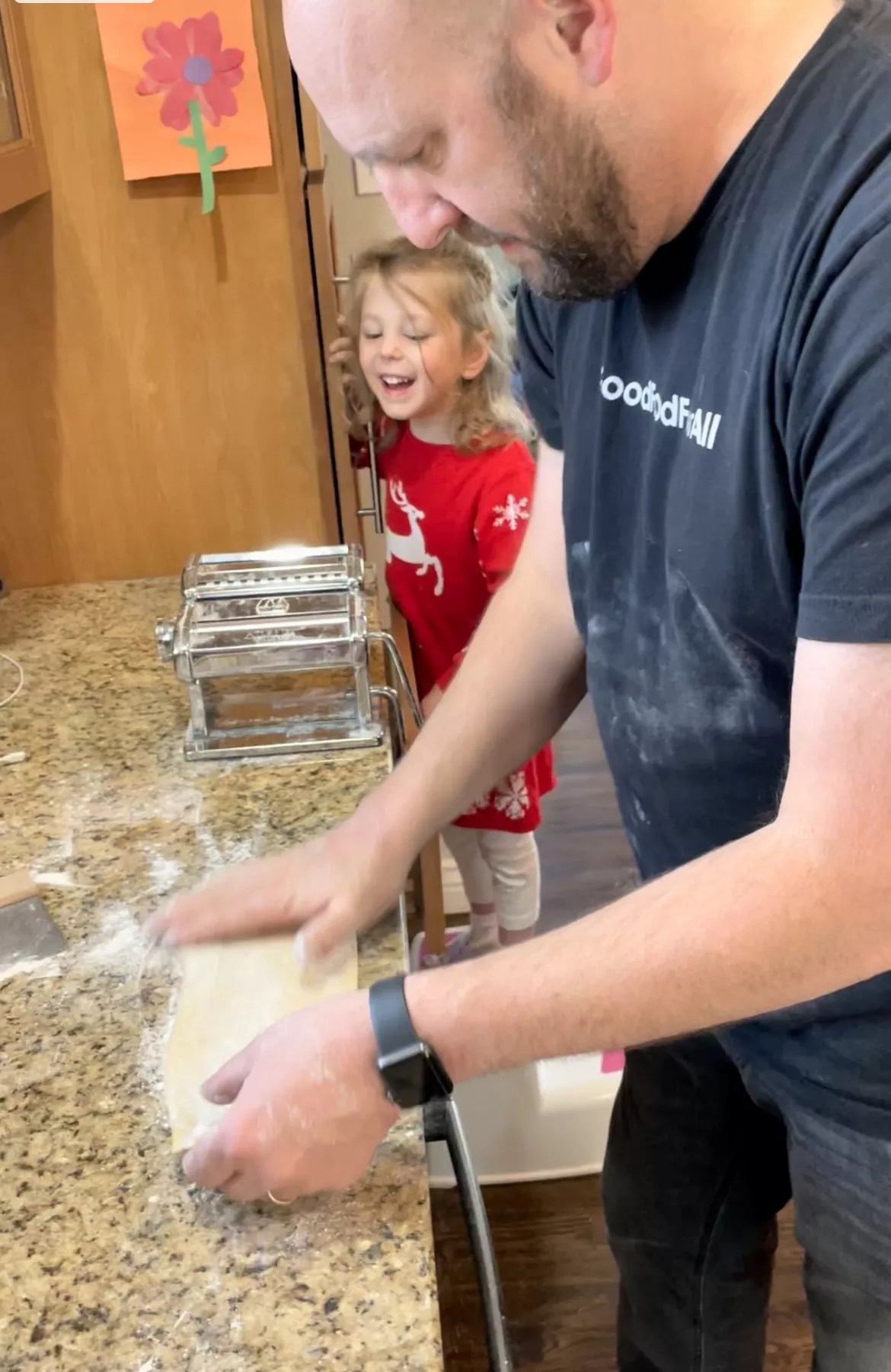Sophie smiles while Rosenberg makes pasta at home.