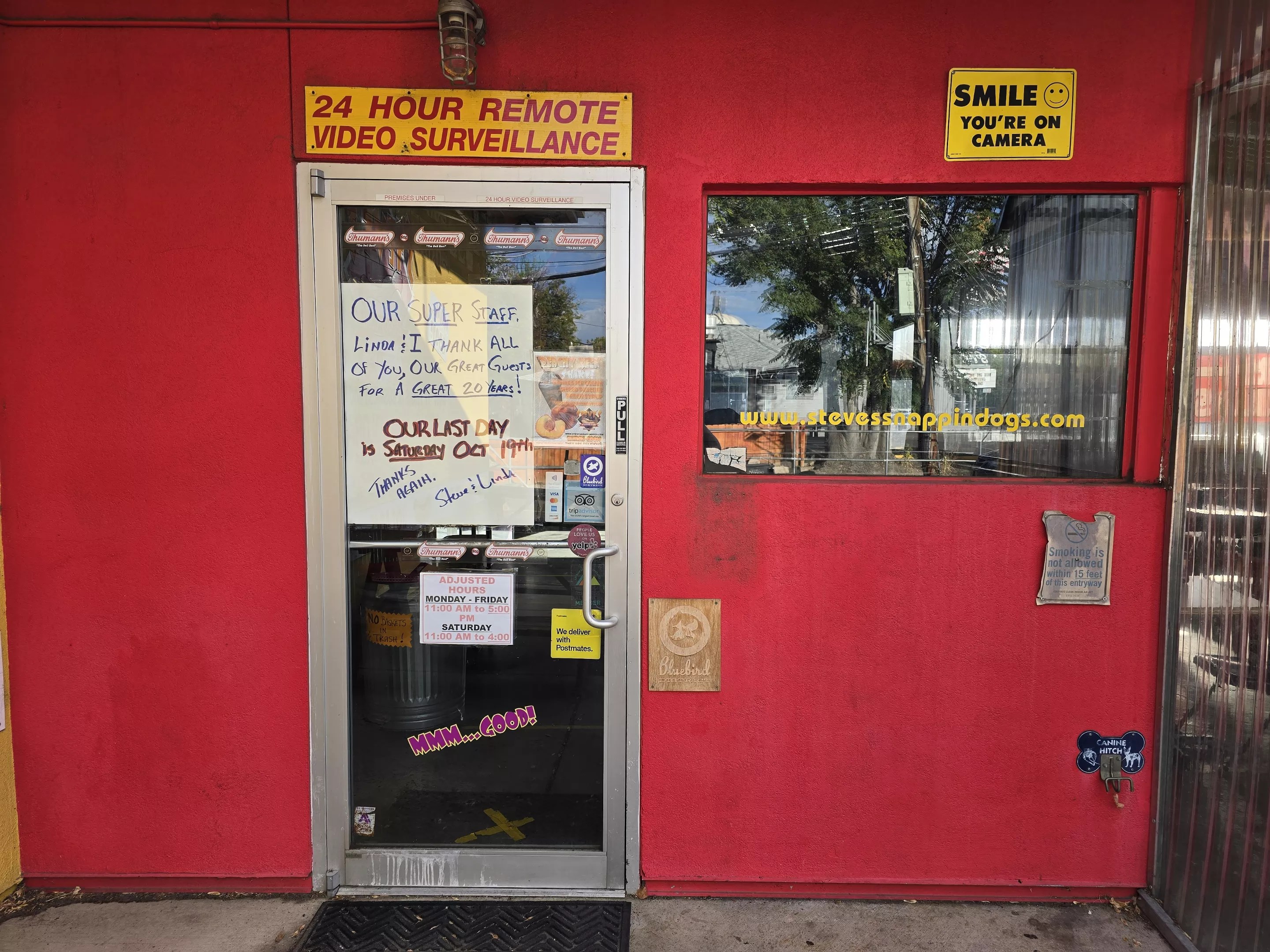 Steve and Linda Ballas opened Steve’s Snappin’ Dogs on the corner of Colfax and Monroe back in 2006 and quickly made a big impression, winning Best New Store on Colfax in that year’s Best of Denver. Now there’s a large “store closing” sign hanging on the front of 3525 East Colfax Avenue and handwritten a sign on the door that says, “Our super staff, Linda and I thank all of you, our great guests, for a great twenty years.”