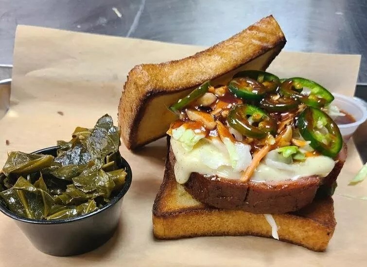 Stuboy’s serves a thick-cut smoked bologna sandwich, here with a side of collard greens.