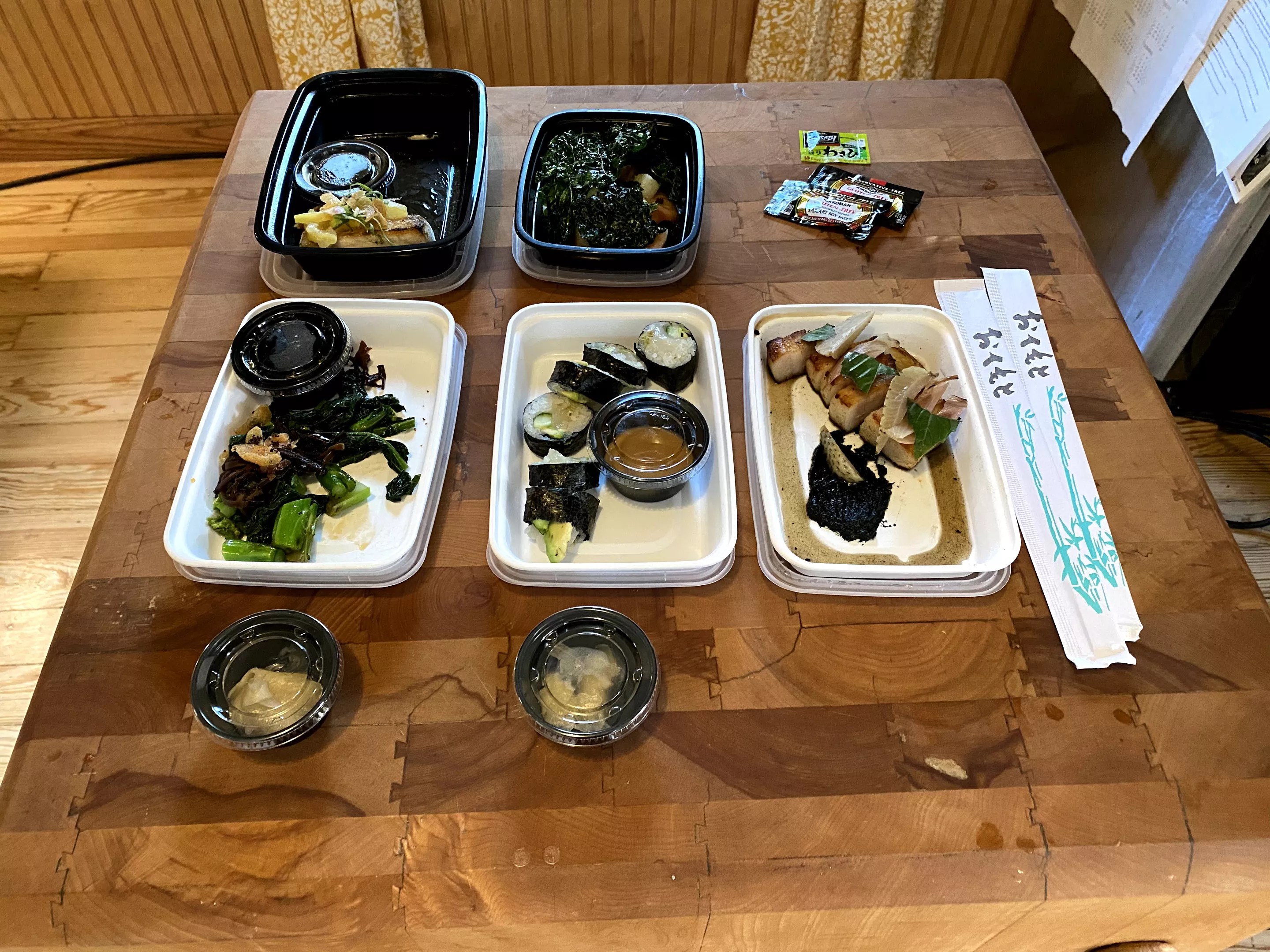 An array of Uchi happy hour sushi and other dishes ready turns my living room into a Japanese restaurant.