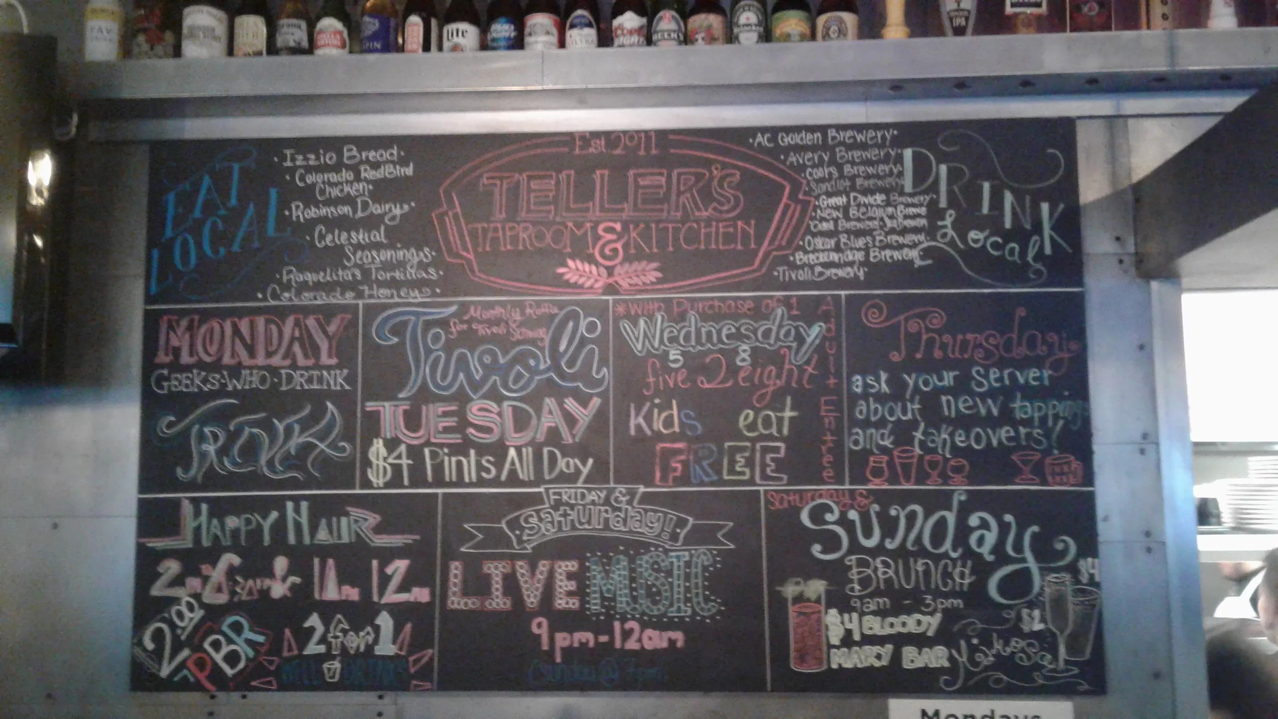 Teller’s makes mingling easy with activities for every taste, from Monday night Geeks Who Drink trivia to live music on Friday, Saturday and Sunday nights. Brave patrons can even take the stage themselves the last Sunday of the month, during open-mic night. Brunch is also big on Sundays, and the staff at Teller’s serves a special hangover brunch on New Year’s Day after an annual New Year’s Eve party. The bar also stays open on holidays such as Labor Day and Memorial Day for eating, drinking and celebrating. Other special events that go on throughout the year are “dine to donate” events, with a portion of proceeds going to local schools Maple Grove, Stover and Prospect Valley. Another favored cause for the team at Teller’s is animal welfare, and the bar hosts events benefiting the Foothills Animal Shelter and Pinups for Pitbulls, a charity that raises money through fun calendars of models posing with pit bulls.