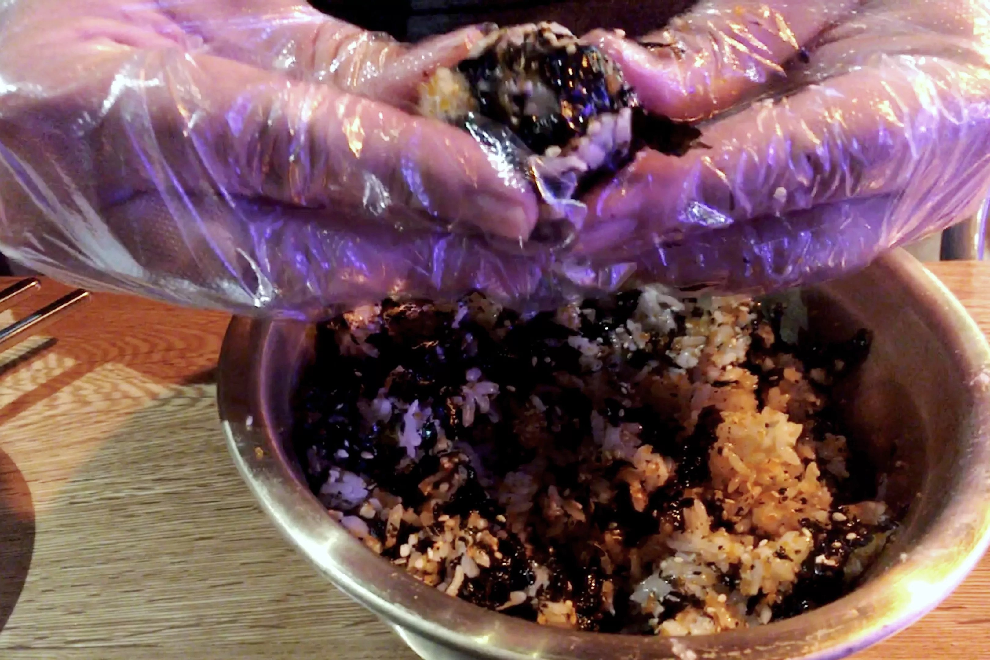 Fortunately, the kitchen provides gloves along with its DIY rice balls.