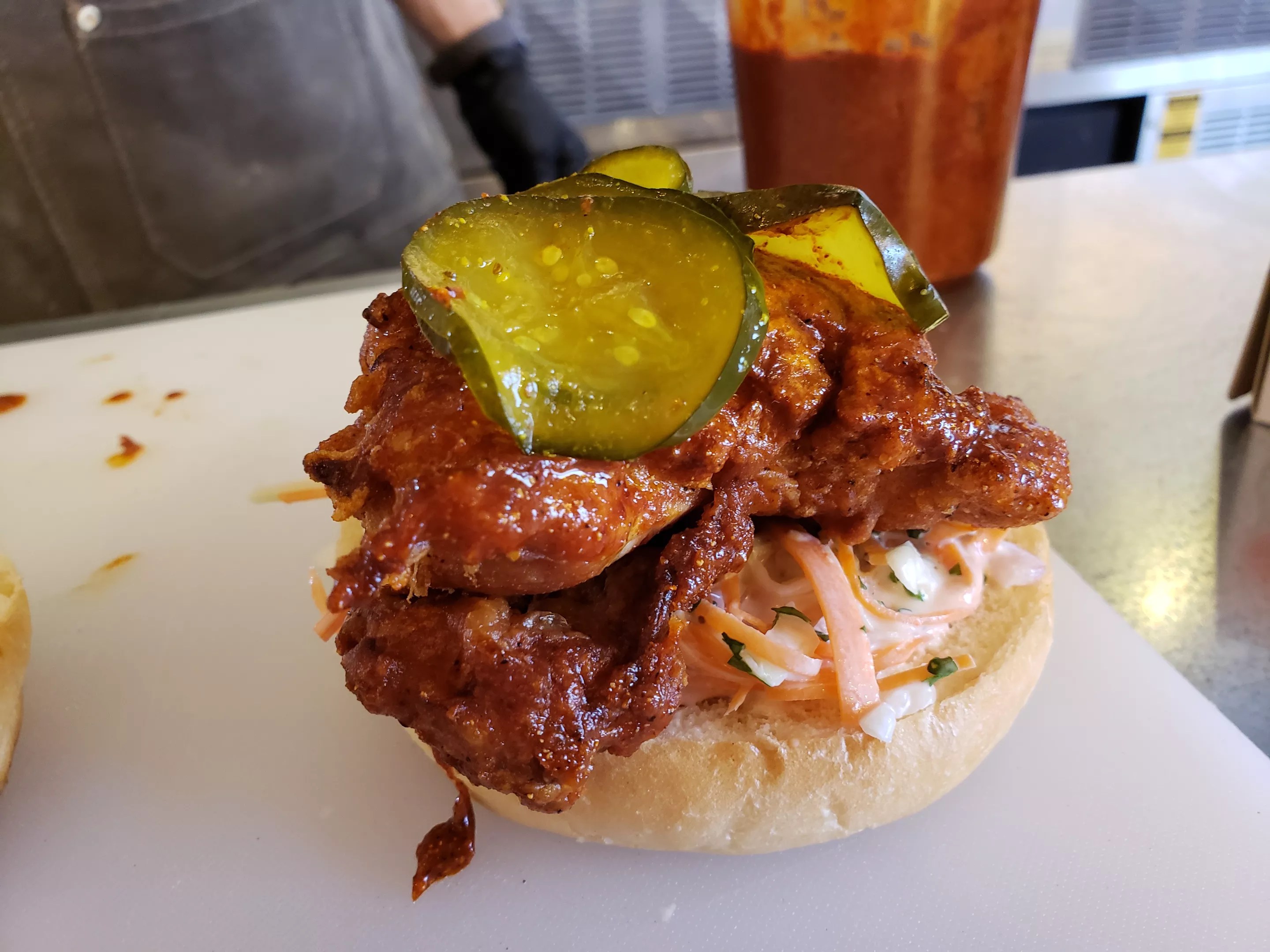 A sampling of a sandwich from the Budlong Hot Chicken.