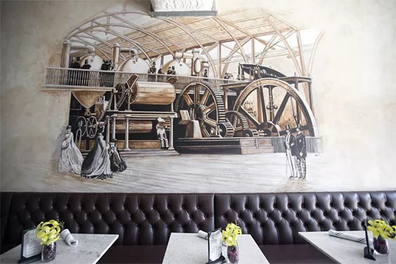 Rumor has it this mural at Sugarmill depicts a vintage pie-crust-rolling apparatus.
