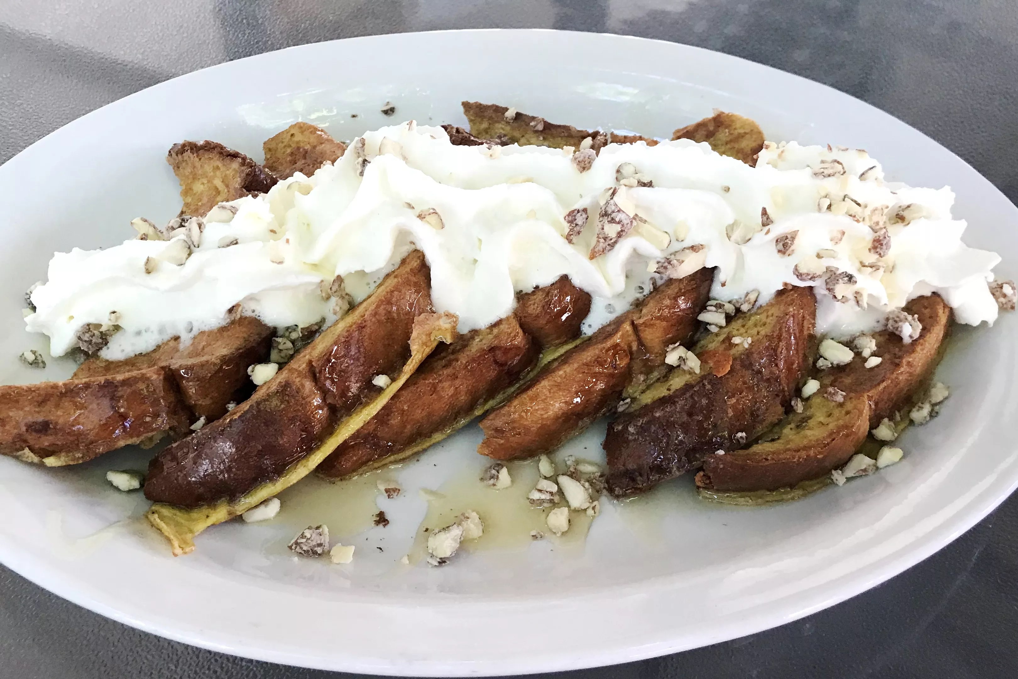 The Car Bomb French toast is a conversation-stopper from Christian’s creative mind. It’s made with challah soaked in a mixture of eggs and Yeti imperial stout (from Great Divide Brewing just across the street), with a topping of Jameson-spiked honey and Baileys whipped cream. It definitely evokes the beer-and-shot combo the dish is named after, but then takes it into comforting brunch territory with a sprinkling of candied almonds.