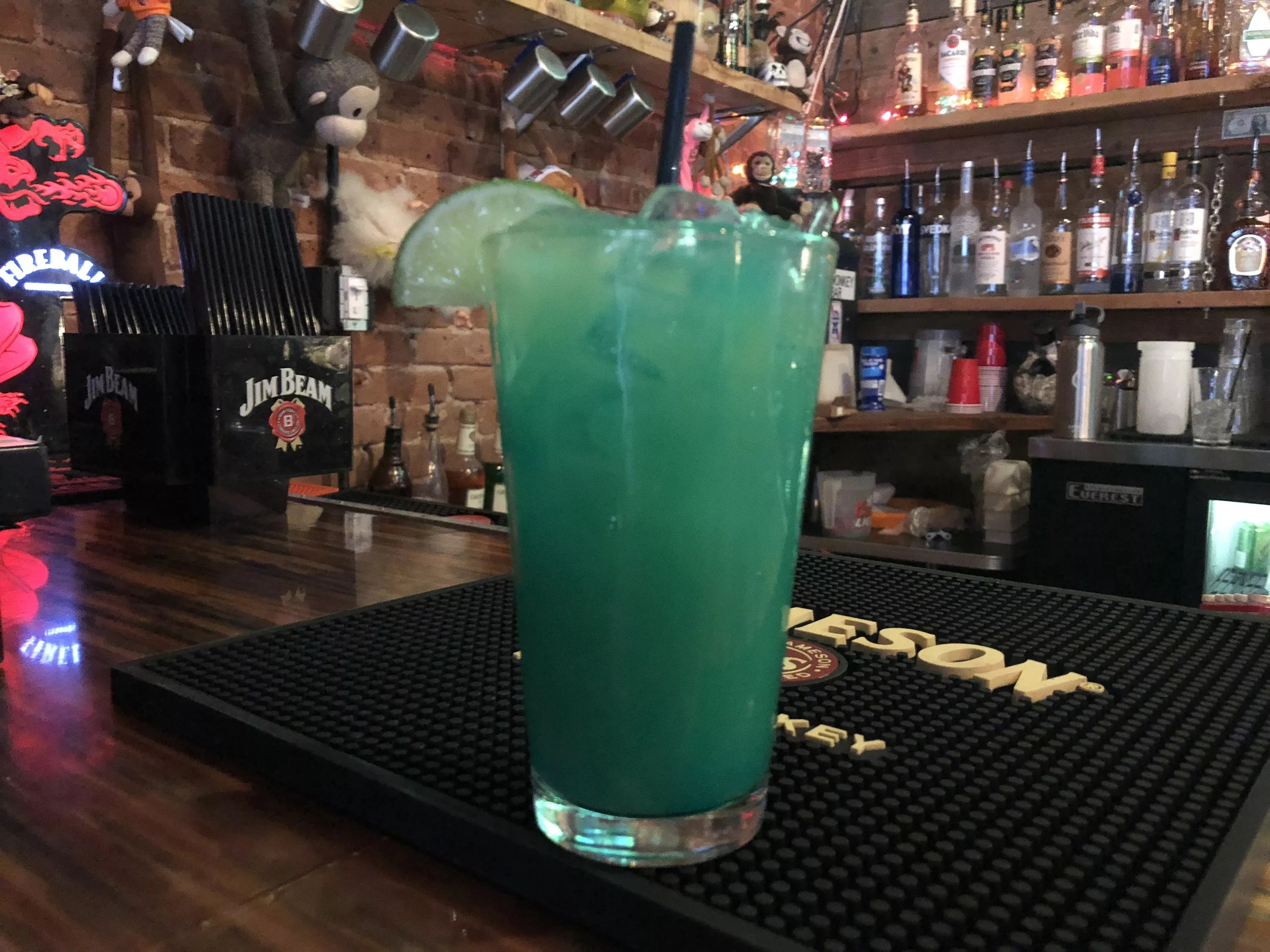 Patrons love the strong and creative drinks at the Monkey Bar, such as this blue version of a Long Island Iced Tea, called both the Funky Monkey and King Kong.