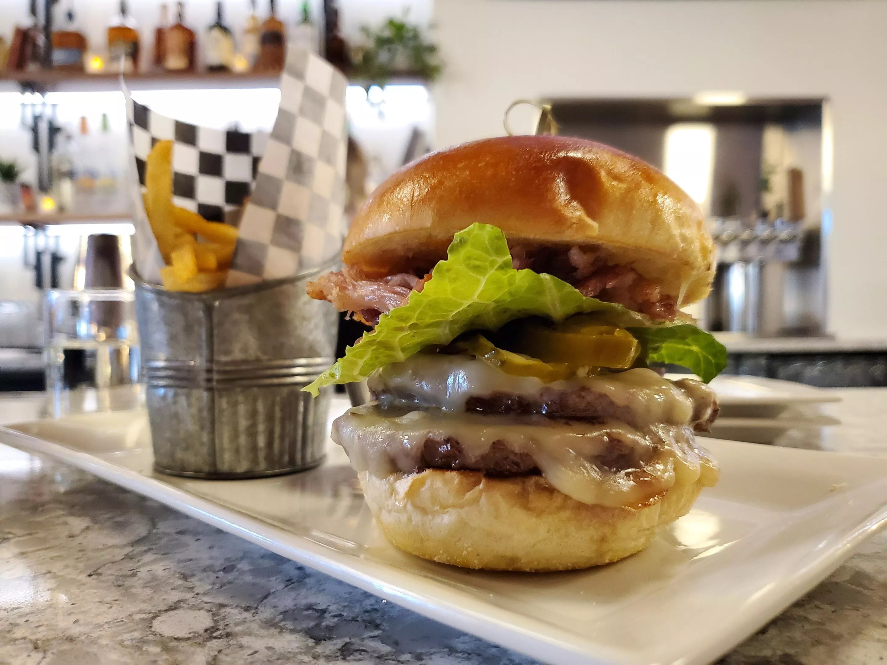 The food menu is centered on burgers, but there are a few small plates as well, including loaded “scoop” fries, which are wide and ideal for dipping. “Those were something I pushed for,” Carrie says. “I think French fries are an art, and those are the perfect French fry to me.” They come loaded with cheese, pickled jalapeño, green onion and pulled pork belly bacon, which is exactly what it sounds like – a meaty treat with the texture of pulled pork and the smoky flavor of bacon.