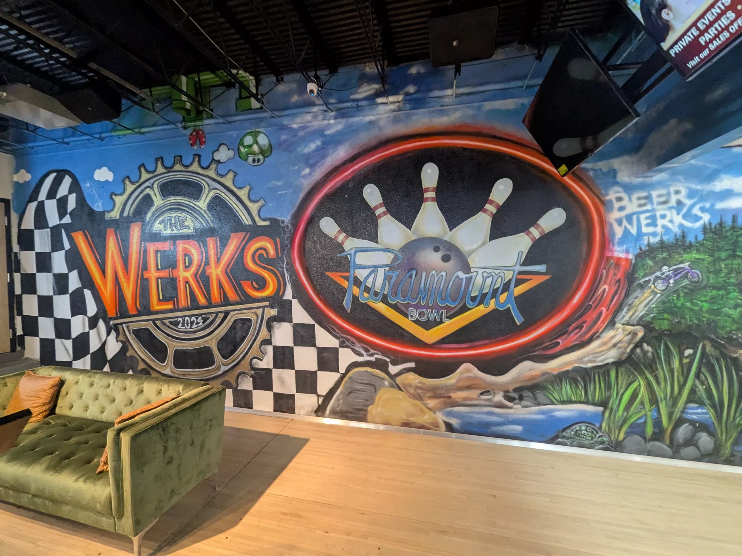 Porter commissioned a local artist to retouch the Paramount Bowl logo and incorporate it into a large mural in the space.