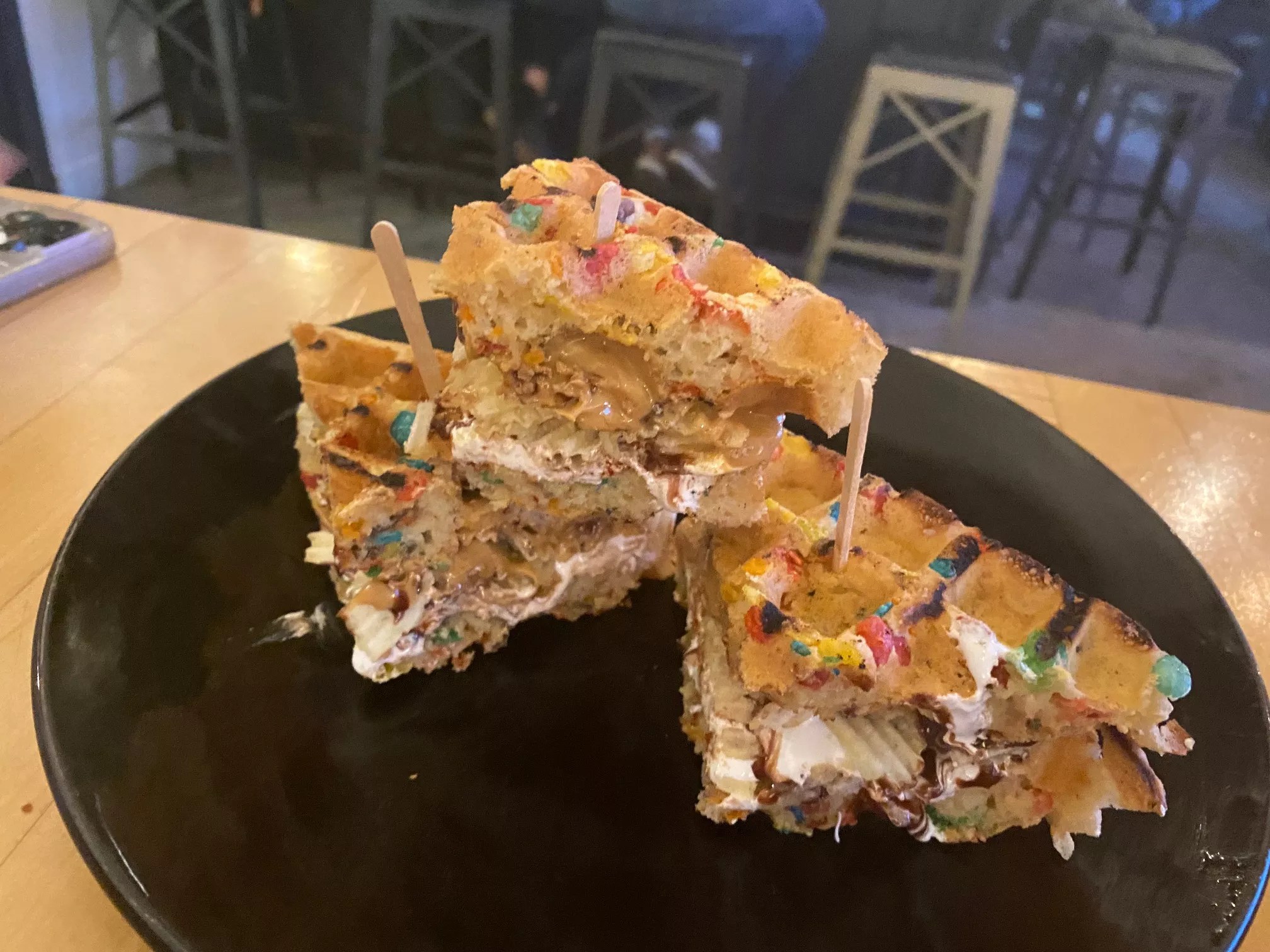 From a fried chicken waffle sandwich drizzled with black cardamom hot honey to a Fluffer Nutter sandwich served on a Fruity Pebbles sourdough waffle with peanut butter, Marshmallow Fluff, Ruffles potato chips and chocolate ganache, the menu IS filled with fun and creative bites. “If I had to pick one that is just like the ultimate banger and isn’t ever going to disappoint you, it’s the Italian Grinder,” Smith says. “It’s a thick-cut ham steak with Genoa salami, roasted red peppers, caramelized onions, pepper Jack cheese and housemade Italian herb olive oil. Something about it just really sings when you eat it. It’s fucking money.”