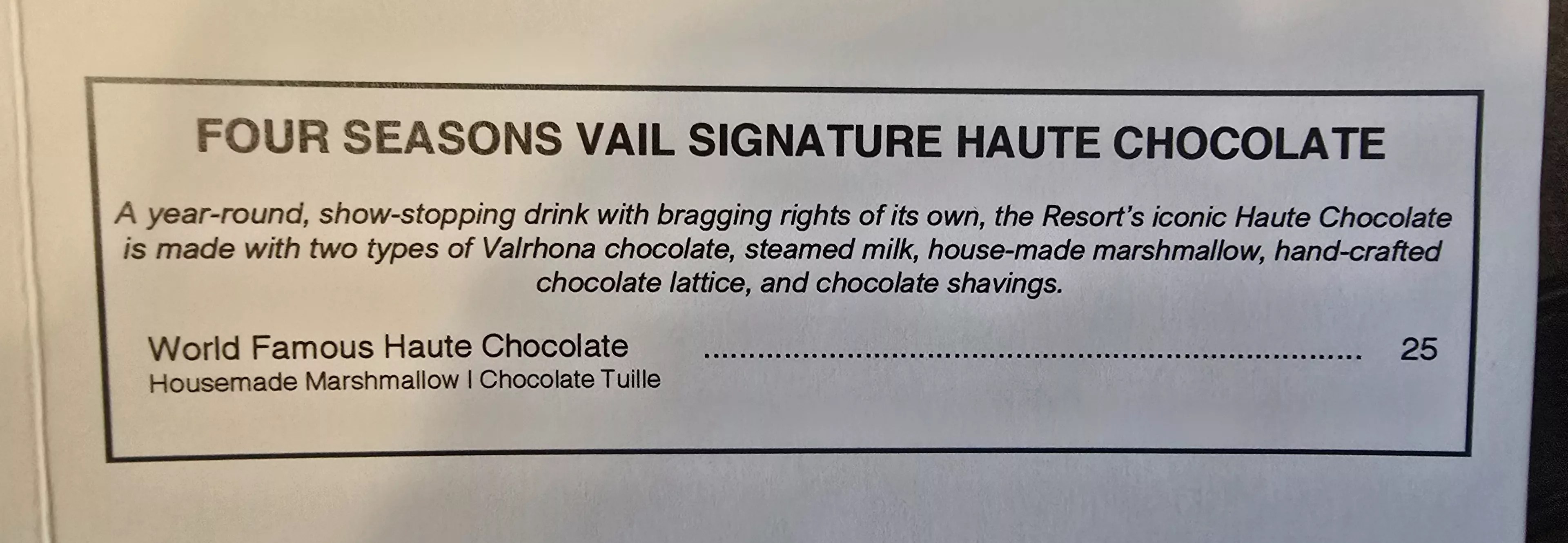 Vail isn’t known for being cheap – the Remedy Bar and Tavernetta Vail both have $19 freshly squeezed orange juice with orange ginger ice cubes on their breakfast menus, so $25 for hot chocolate seems pretty on par. (You can also opt to spike that hot chocolate with Bailey’s, Kahlua, Frangelico or Peppermint Schnapps for an additional $6.)